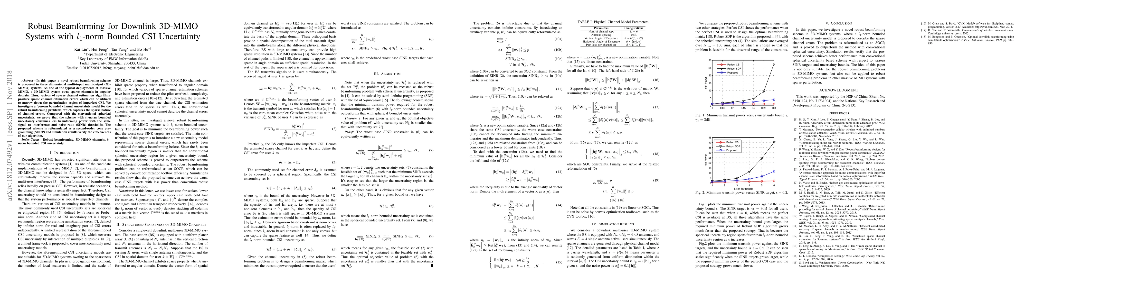 This paper proposes a novel robust beamforming scheme for 3D-MIMO systems that utilizes $l_1$-norm bounded channel uncertainty to minimize beamforming power. The scheme is reformulated as a second-order cone programming (SOCP) and outperforms conventional spherical uncertainty models in terms of power consumption while maintaining signal to interference and noise ratio (SINR) thresholds.