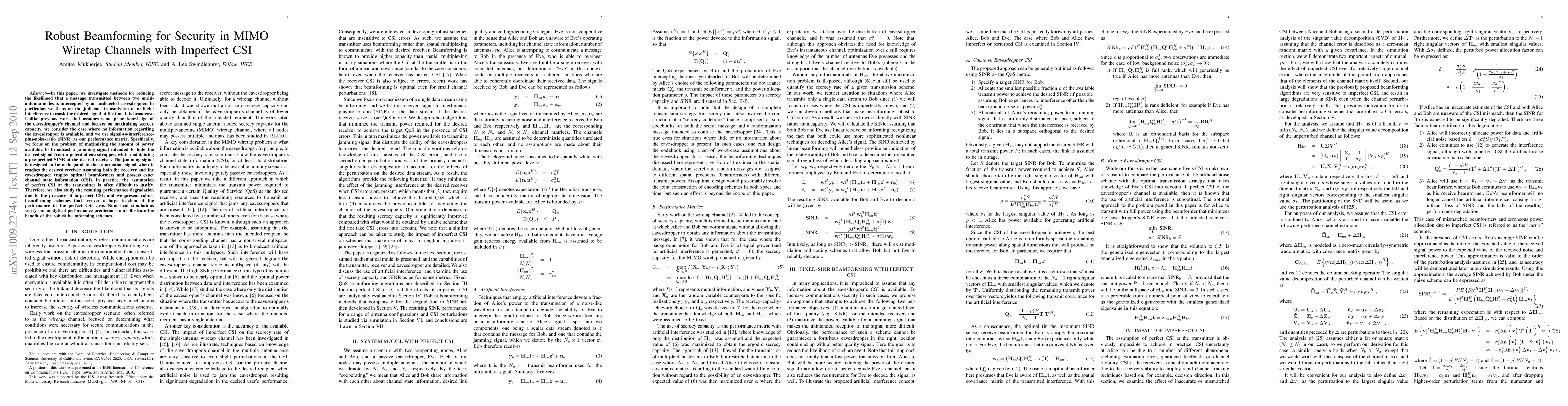In this paper, we investigate methods for reducing the likelihood that a message transmitted between two multiantenna nodes is intercepted by an undetected eavesdropper. In particular, we focus on the judicious transmission of artificial interference to mask the desired signal at the time it is broadcast. Unlike previous work that assumes some prior knowledge of the eavesdropper's channel and focuses on maximizing secrecy capacity, we consider the case where no information regarding the eavesdropper is available, and we use signal-to-interference-plus-noise-ratio (SINR) as our performance metric. Specifically, we focus on the problem of maximizing the amount of power available to broadcast a jamming signal intended to hide the desired signal from a potential eavesdropper, while maintaining a prespecified SINR at the desired receiver. The jamming signal is designed to be orthogonal to the information signal when it reaches the desired receiver, assuming both the receiver and the eavesdropper employ optimal beamformers and possess exact channel state information (CSI). In practice, the assumption of perfect CSI at the transmitter is often difficult to justify. Therefore, we also study the resulting performance degradation due to the presence of imperfect CSI, and we present robust beamforming schemes that recover a large fraction of the performance in the perfect CSI case. Numerical simulations verify our analytical performance predictions, and illustrate the benefit of the robust beamforming schemes.