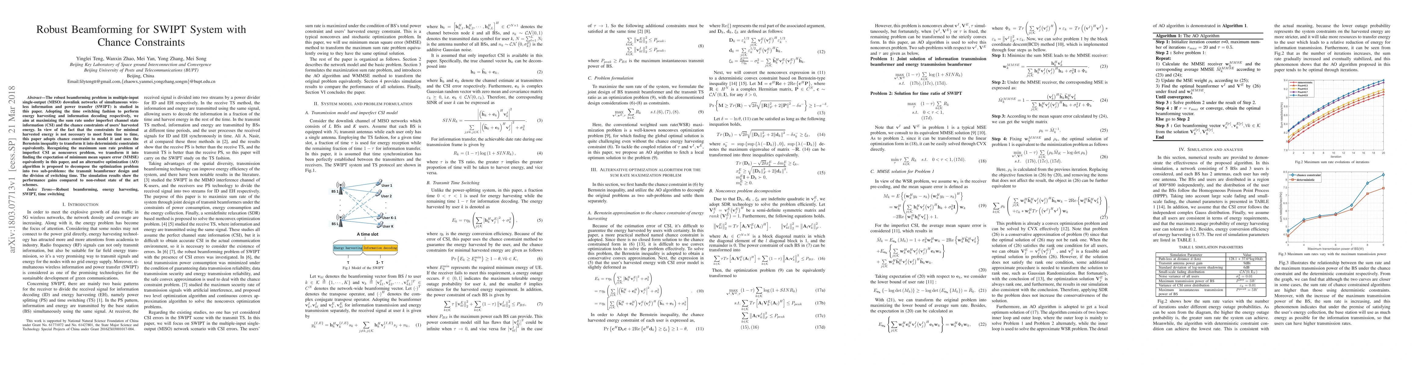 This paper proposes a robust beamforming method for SWIPT systems with chance constraints, aiming to maximize sum rate under imperfect CSI, and demonstrates performance gains compared to non-robust schemes.