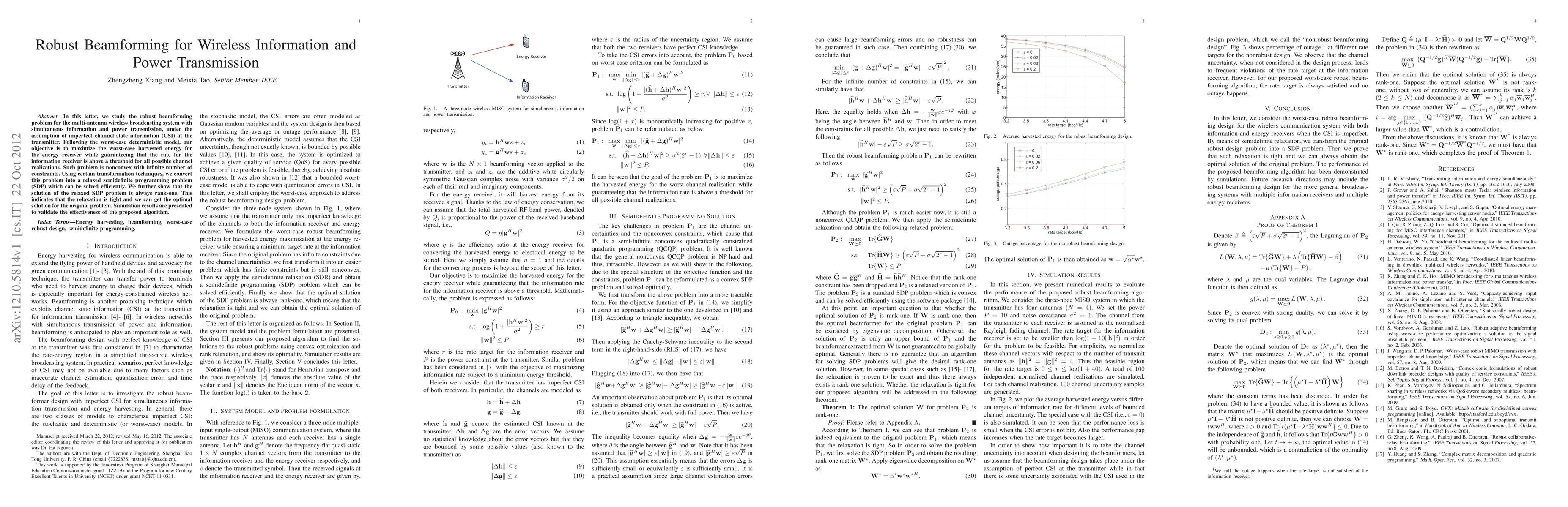 In this letter, we study the robust beamforming problem for the multi-antenna wireless broadcasting system with simultaneous information and power transmission, under the assumption of imperfect channel state information (CSI) at the transmitter. Following the worst-case deterministic model, our objective is to maximize the worst-case harvested energy for the energy receiver while guaranteeing that the rate for the information receiver is above a threshold for all possible channel realizations. Such problem is nonconvex with infinite number of constraints. Using certain transformation techniques, we convert this problem into a relaxed semidefinite programming problem (SDP) which can be solved efficiently. We further show that the solution of the relaxed SDP problem is always rank-one. This indicates that the relaxation is tight and we can get the optimal solution for the original problem. Simulation results are presented to validate the effectiveness of the proposed algorithm.