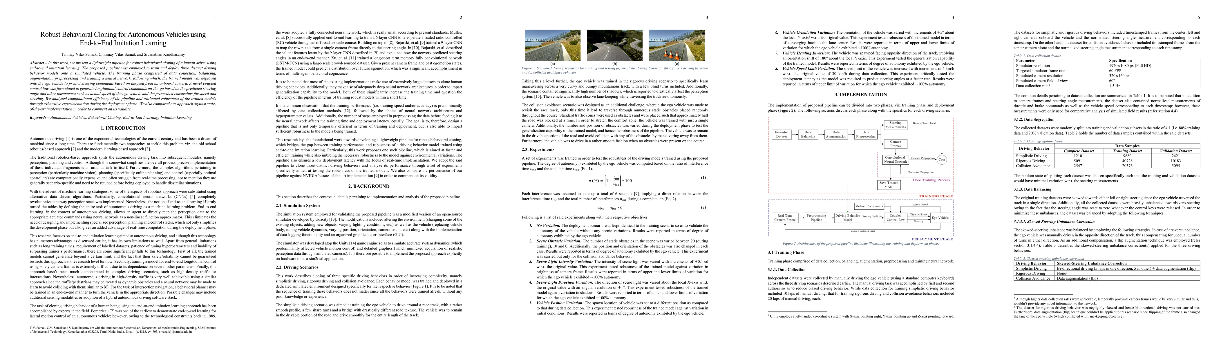 This paper proposes a lightweight pipeline for robust behavioral cloning using end-to-end imitation learning, successfully training and deploying three driving behavior models onto a simulated vehicle. The approach includes a novel coupled control law for generating longitudinal commands and demonstrates computational efficiency and robustness through extensive experimentation.
