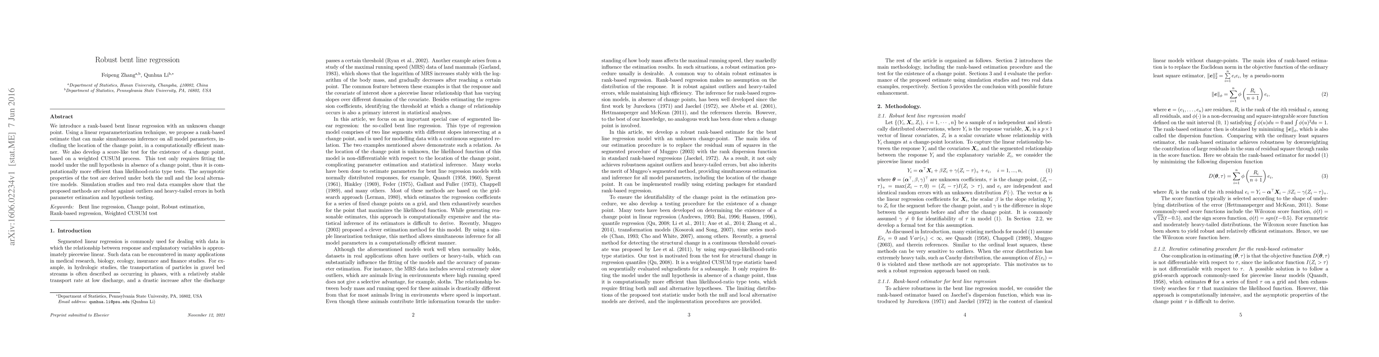 We introduce a rank-based bent linear regression with an unknown change point. Using a linear reparameterization technique, we propose a rank-based estimate that can make simultaneous inference on all model parameters, including the location of the change point, in a computationally efficient manner. We also develop a score-like test for the existence of a change point, based on a weighted CUSUM process. This test only requires fitting the model under the null hypothesis in absence of a change point, thus it is computationally more efficient than likelihood-ratio type tests. The asymptotic properties of the test are derived under both the null and the local alternative models. Simulation studies and two real data examples show that the proposed methods are robust against outliers and heavy-tailed errors in both parameter estimation and hypothesis testing.