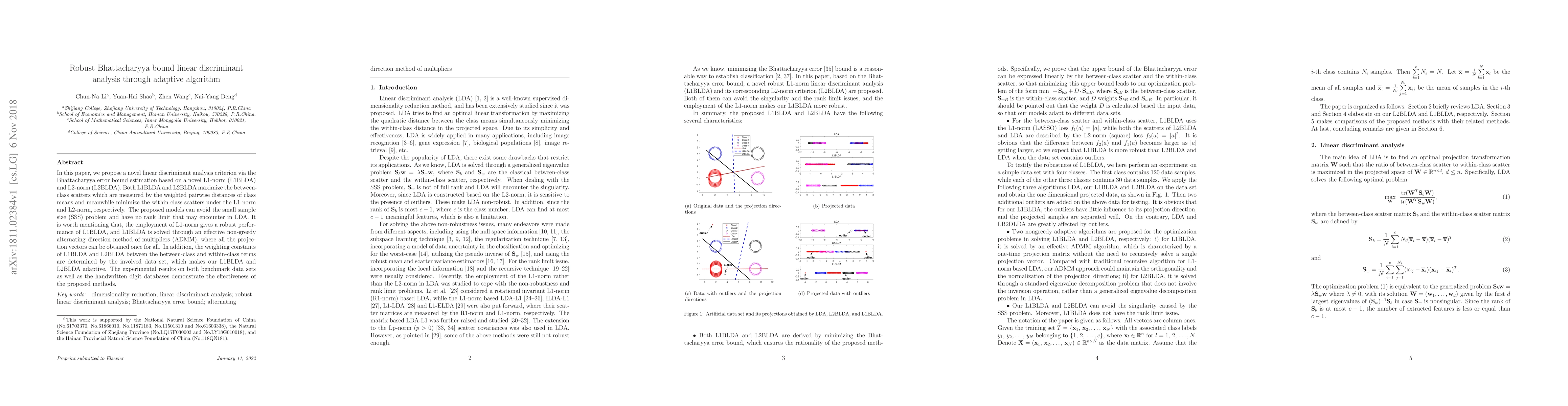 In this paper, we propose a novel linear discriminant analysis criterion via the Bhattacharyya error bound estimation based on a novel L1-norm (L1BLDA) and L2-norm (L2BLDA). Both L1BLDA and L2BLDA maximize the between-class scatters which are measured by the weighted pairwise distances of class means and meanwhile minimize the within-class scatters under the L1-norm and L2-norm, respectively. The proposed models can avoid the small sample size (SSS) problem and have no rank limit that may encounter in LDA. It is worth mentioning that, the employment of L1-norm gives a robust performance of L1BLDA, and L1BLDA is solved through an effective non-greedy alternating direction method of multipliers (ADMM), where all the projection vectors can be obtained once for all. In addition, the weighting constants of L1BLDA and L2BLDA between the between-class and within-class terms are determined by the involved data set, which makes our L1BLDA and L2BLDA adaptive. The experimental results on both benchmark data sets as well as the handwritten digit databases demonstrate the effectiveness of the proposed methods.