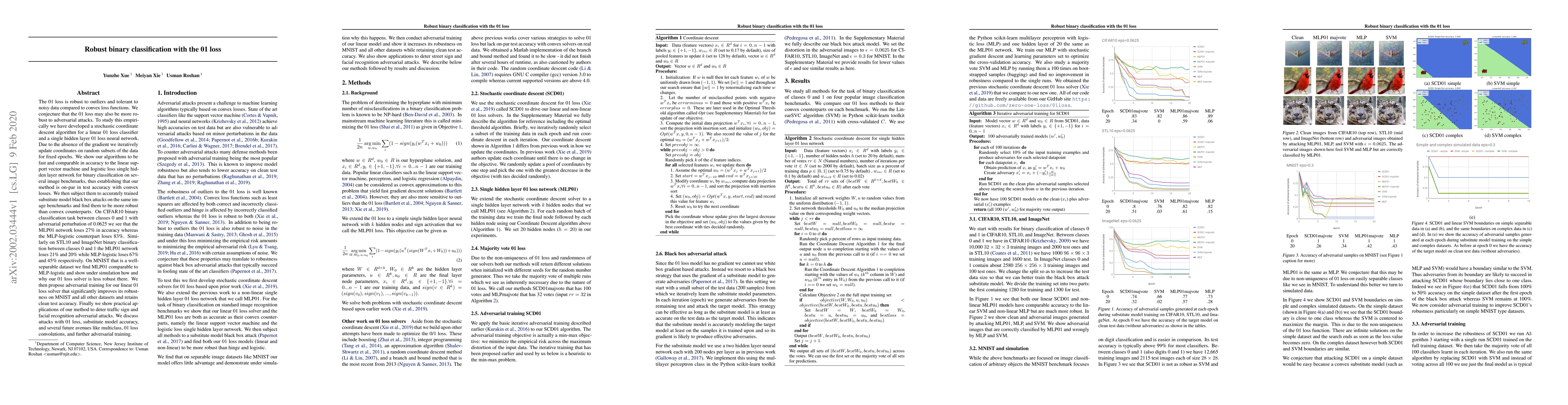 The 01 loss is robust to outliers and tolerant to noisy data compared to convex loss functions. We conjecture that the 01 loss may also be more robust to adversarial attacks. To study this empirically we have developed a stochastic coordinate descent algorithm for a linear 01 loss classifier and a single hidden layer 01 loss neural network. Due to the absence of the gradient we iteratively update coordinates on random subsets of the data for fixed epochs. We show our algorithms to be fast and comparable in accuracy to the linear support vector machine and logistic loss single hidden layer network for binary classification on several image benchmarks, thus establishing that our method is on-par in test accuracy with convex losses. We then subject them to accurately trained substitute model black box attacks on the same image benchmarks and find them to be more robust than convex counterparts. On CIFAR10 binary classification task between classes 0 and 1 with adversarial perturbation of 0.0625 we see that the MLP01 network loses 27\% in accuracy whereas the MLP-logistic counterpart loses 83\%. Similarly on STL10 and ImageNet binary classification between classes 0 and 1 the MLP01 network loses 21\% and 20\% while MLP-logistic loses 67\% and 45\% respectively. On MNIST that is a well-separable dataset we find MLP01 comparable to MLP-logistic and show under simulation how and why our 01 loss solver is less robust there. We then propose adversarial training for our linear 01 loss solver that significantly improves its robustness on MNIST and all other datasets and retains clean test accuracy. Finally we show practical applications of our method to deter traffic sign and facial recognition adversarial attacks. We discuss attacks with 01 loss, substitute model accuracy, and several future avenues like multiclass, 01 loss convolutions, and further adversarial training.