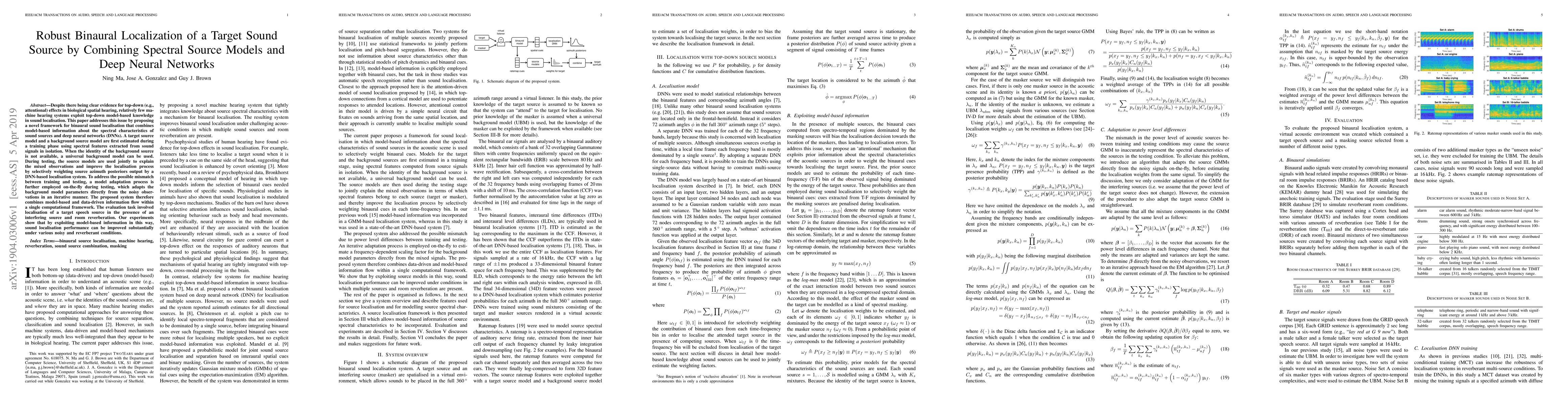 This paper proposes a novel framework for binaural sound localization that combines spectral source models with deep neural networks to enhance localization performance in noisy environments. The system adapts background models on-the-fly to improve localization accuracy for target speech sources amidst interfering sounds and reverberation.