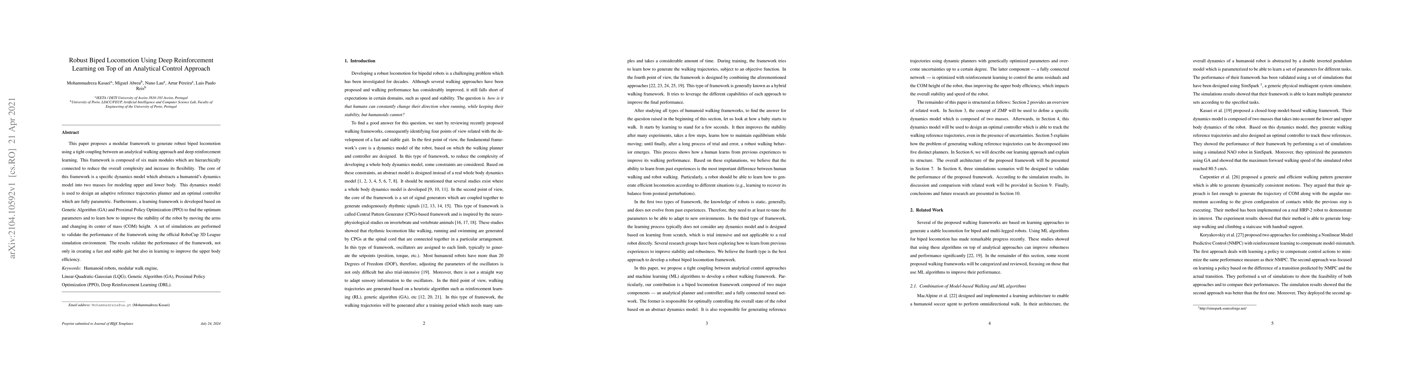 This paper presents a modular framework combining analytical control and deep reinforcement learning to achieve robust biped locomotion. The framework uses a simplified dynamics model to design adaptive reference trajectories and an optimal controller, while reinforcement learning optimizes stability through arm movements and center of mass adjustments. Simulation results in the RoboCup 3D League environment demonstrate its effectiveness in creating stable and efficient gaits.