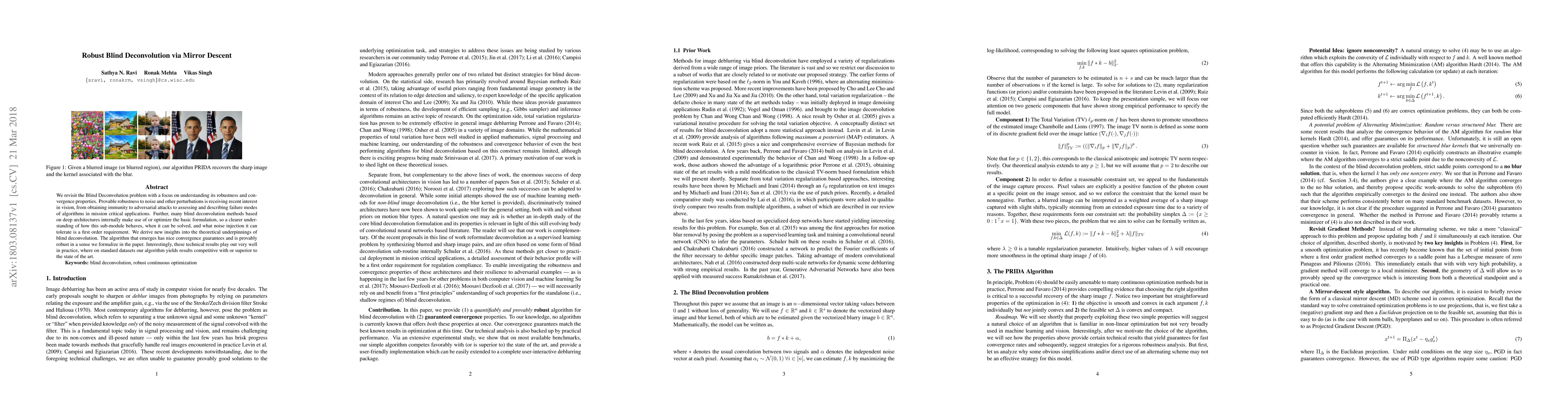 This paper explores the robustness and convergence of blind deconvolution, introducing a mirror descent algorithm with provable robustness to noise and adversarial attacks. The proposed method demonstrates competitive performance on standard datasets, highlighting its practical effectiveness.