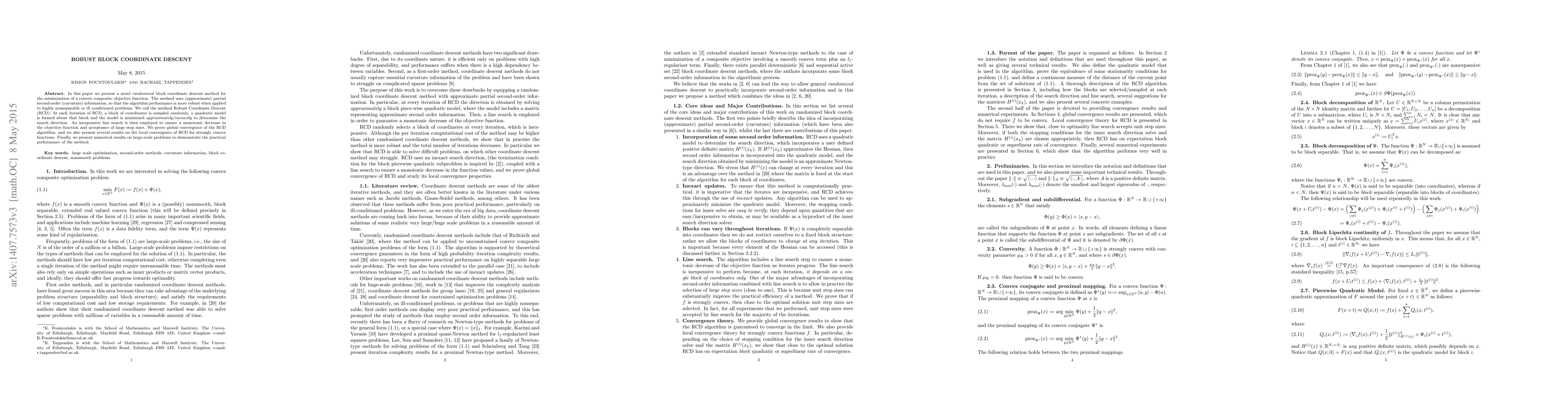 This paper introduces Robust Coordinate Descent (RCD), a randomized block coordinate method for minimizing convex composite objective functions. RCD leverages approximate partial second-order information to enhance robustness for nonseparable or ill-conditioned problems, proving global and local convergence, and demonstrating practical performance on large-scale problems.