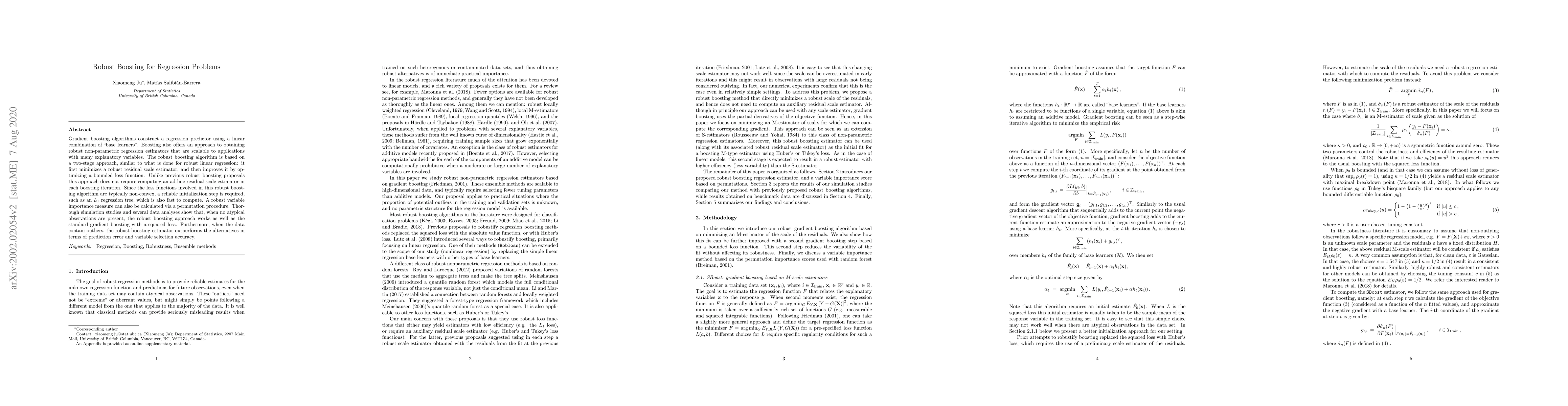 This paper proposes a robust boosting algorithm for regression that minimizes a robust residual scale estimator followed by optimizing a bounded loss function, offering a scalable solution for datasets with many explanatory variables. The method outperforms standard gradient boosting in the presence of outliers, while performing comparably when no atypical observations are present.