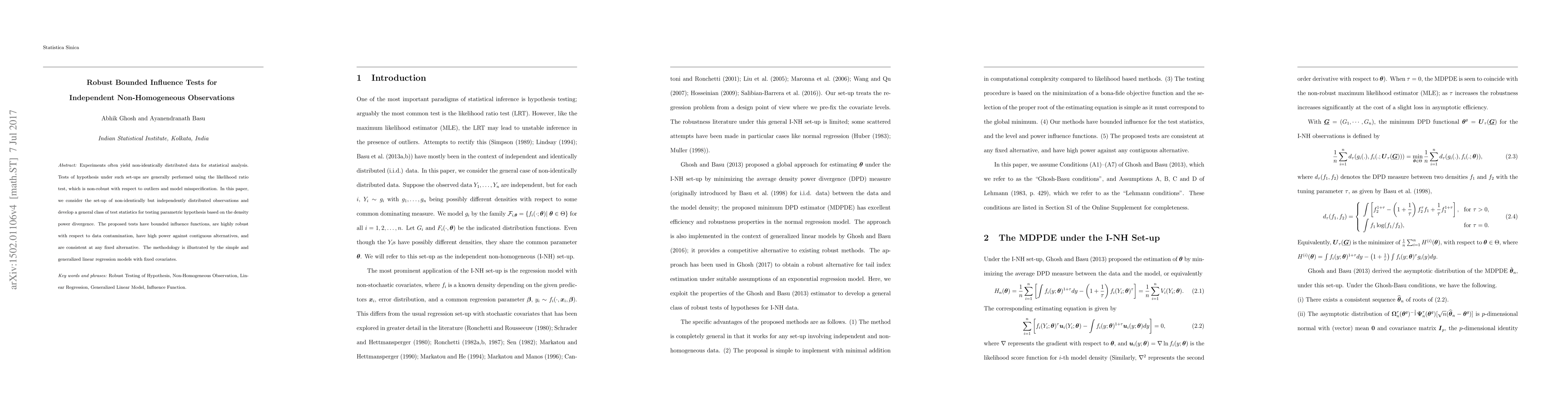 This paper introduces robust tests for statistical hypothesis testing with non-identically distributed independent data, offering bounded influence and high robustness to outliers and model misspecification.