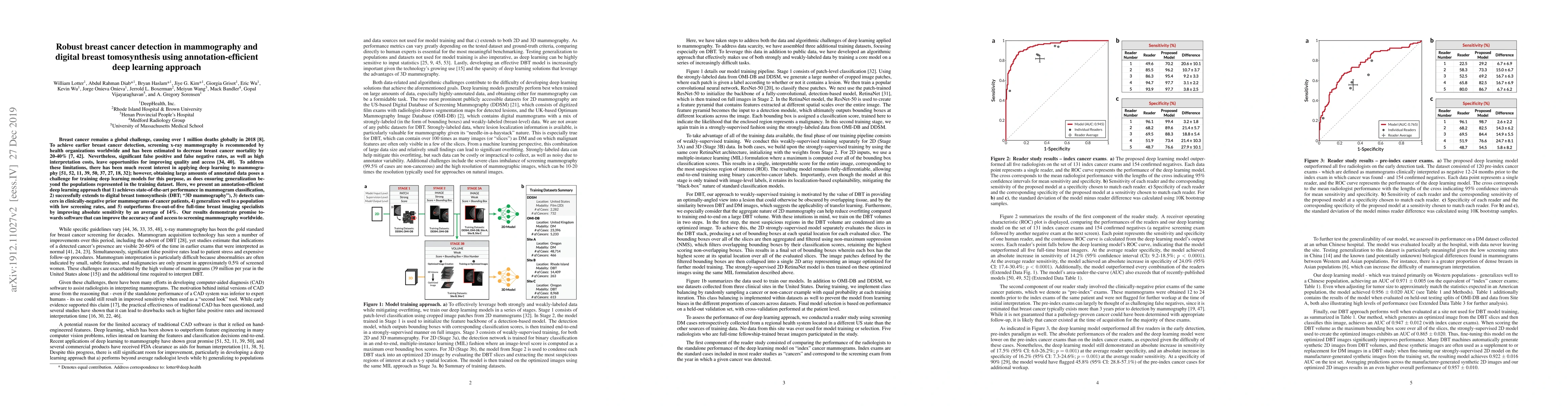 This paper introduces an annotation-efficient deep learning method achieving state-of-the-art performance in breast cancer detection for both mammography and digital breast tomosynthesis, while also demonstrating superior sensitivity compared to breast imaging specialists.