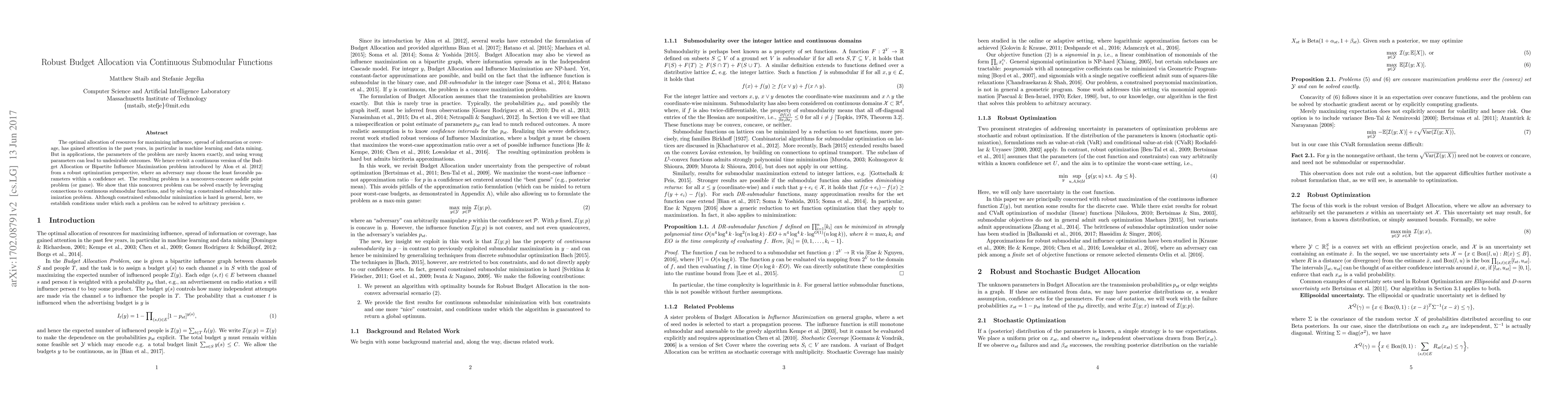 The optimal allocation of resources for maximizing influence, spread of information or coverage, has gained attention in the past years, in particular in machine learning and data mining. But in applications, the parameters of the problem are rarely known exactly, and using wrong parameters can lead to undesirable outcomes. We hence revisit a continuous version of the Budget Allocation or Bipartite Influence Maximization problem introduced by Alon et al. (2012) from a robust optimization perspective, where an adversary may choose the least favorable parameters within a confidence set. The resulting problem is a nonconvex-concave saddle point problem (or game). We show that this nonconvex problem can be solved exactly by leveraging connections to continuous submodular functions, and by solving a constrained submodular minimization problem. Although constrained submodular minimization is hard in general, here, we establish conditions under which such a problem can be solved to arbitrary precision $\epsilon$.