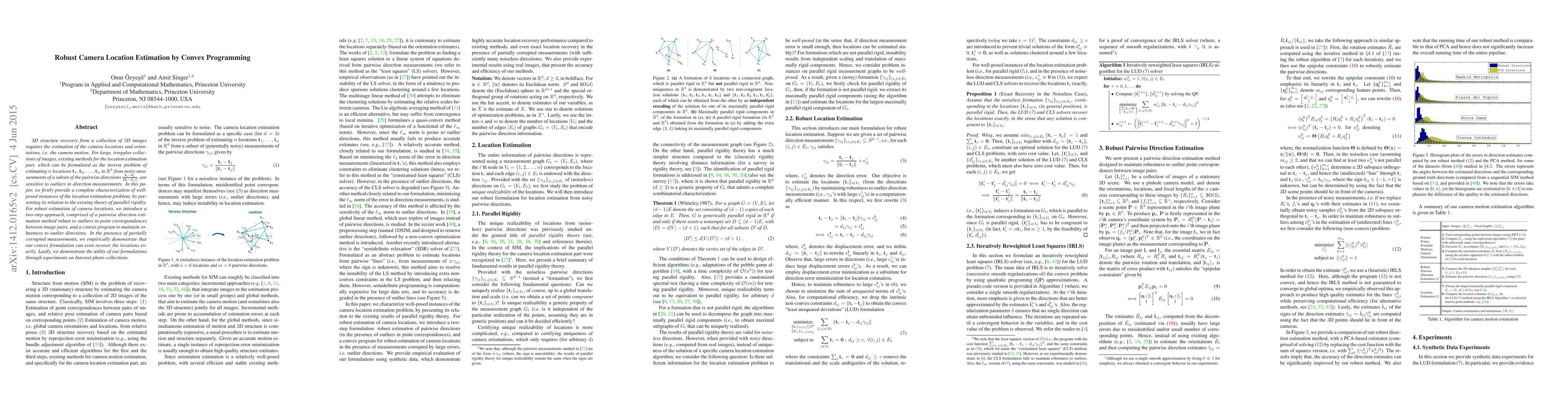 This paper presents a robust method for estimating camera locations in 3D structure recovery from 2D images using convex programming. It introduces a two-step approach combining robust pairwise direction estimation and a convex program to handle outliers, demonstrating exact recovery in partially corrupted measurements and validating the method through experiments on internet photo collections.