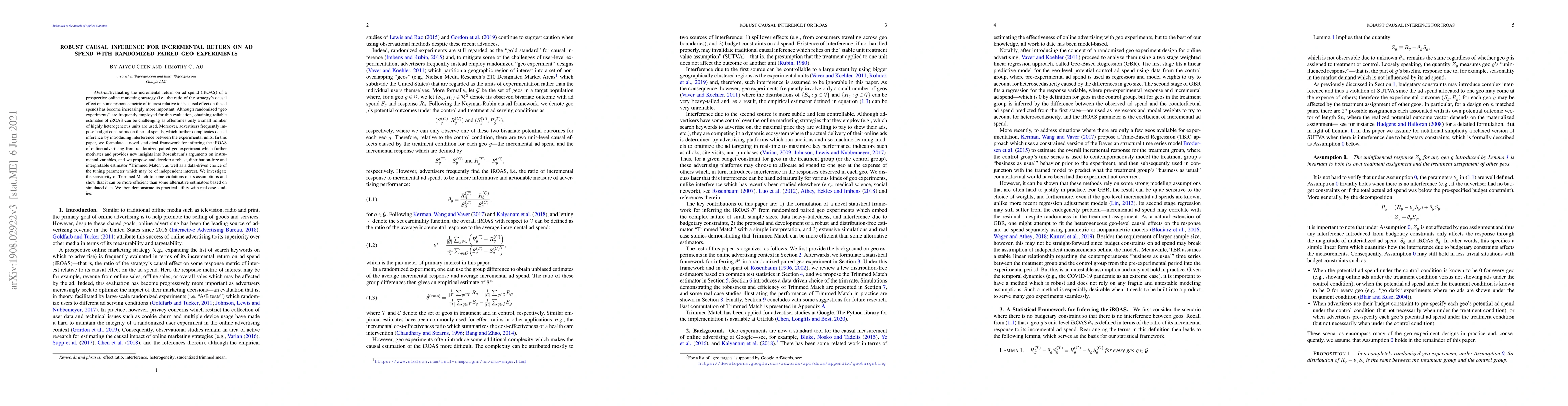 Researchers developed a robust method to estimate incremental return on ad spend (iROAS) from randomized paired geo experiments, improving causal inference with budget constraints. Their approach, called Trimmed Match, offers distribution-free estimates and interpretable results.