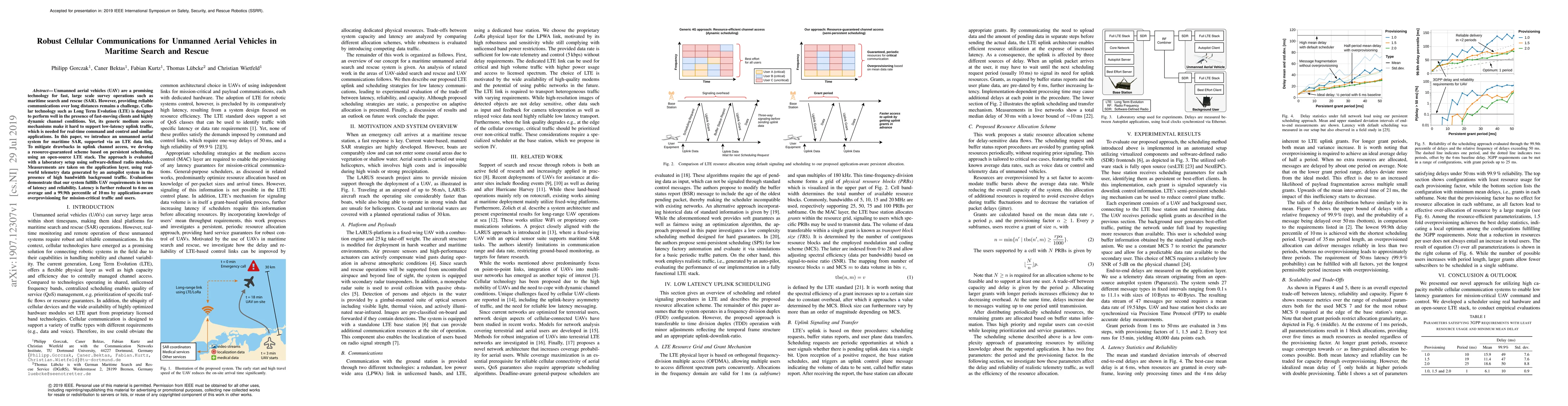 This paper proposes a robust cellular communication system using LTE for UAV-based maritime search and rescue, addressing the challenge of low-latency uplink traffic. The developed resource-guaranteed scheme with persistent scheduling significantly reduces latency to 6 ms on average, ensuring reliable and real-time command and control operations.
