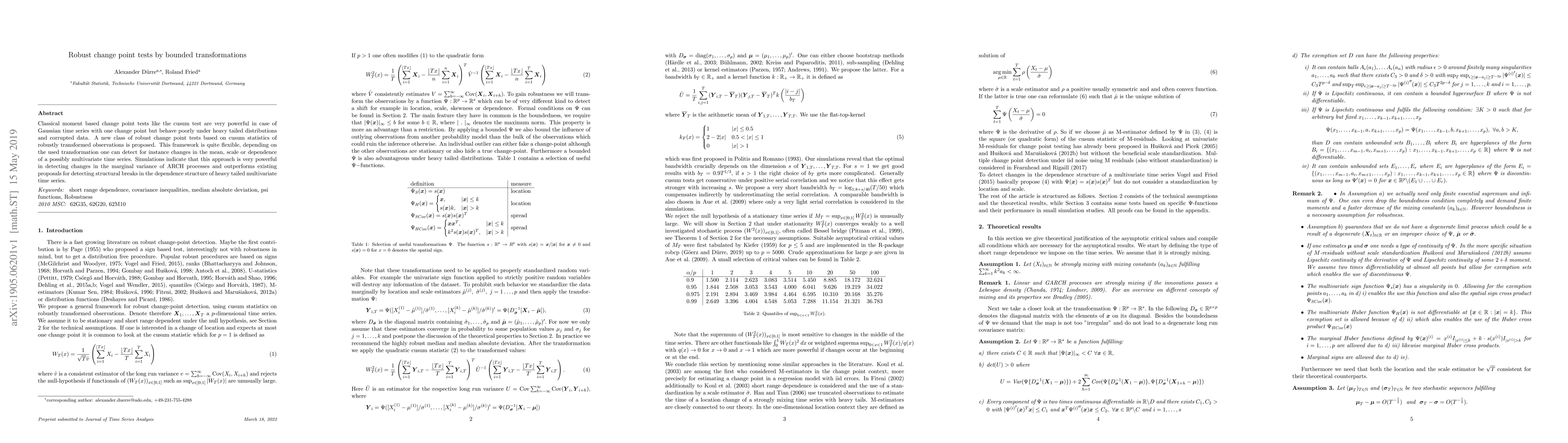 A new class of robust change point tests is proposed to detect changes in time series data with heavy-tailed distributions and corrupted data. These tests outperform existing proposals for detecting structural breaks in dependence structures of multivariate time series.