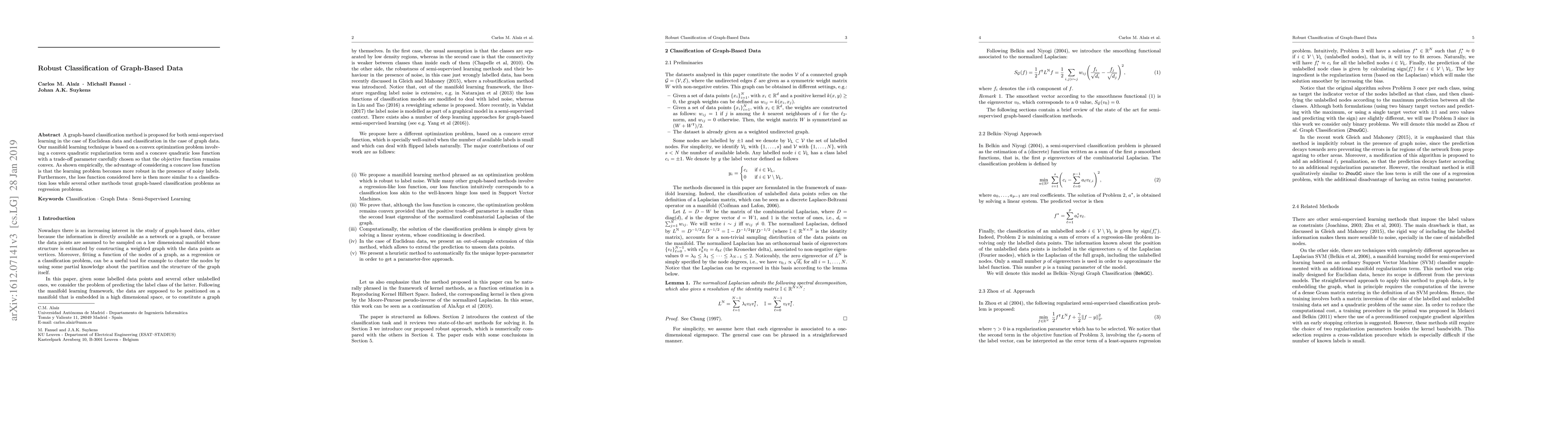 A graph-based classification method is proposed for semi-supervised learning in the case of Euclidean data and for classification in the case of graph data. Our manifold learning technique is based on a convex optimization problem involving a convex quadratic regularization term and a concave quadratic loss function with a trade-off parameter carefully chosen so that the objective function remains convex. As shown empirically, the advantage of considering a concave loss function is that the learning problem becomes more robust in the presence of noisy labels. Furthermore, the loss function considered here is then more similar to a classification loss while several other methods treat graph-based classification problems as regression problems.
