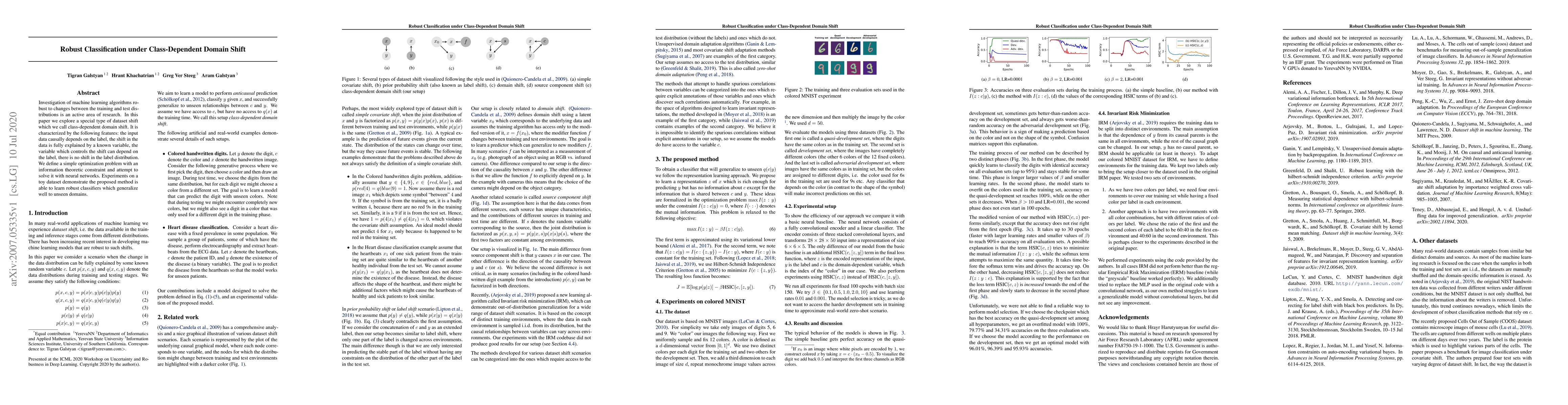 Investigation of machine learning algorithms robust to changes between the training and test distributions is an active area of research. In this paper we explore a special type of dataset shift which we call class-dependent domain shift. It is characterized by the following features: the input data causally depends on the label, the shift in the data is fully explained by a known variable, the variable which controls the shift can depend on the label, there is no shift in the label distribution. We define a simple optimization problem with an information theoretic constraint and attempt to solve it with neural networks. Experiments on a toy dataset demonstrate the proposed method is able to learn robust classifiers which generalize well to unseen domains.