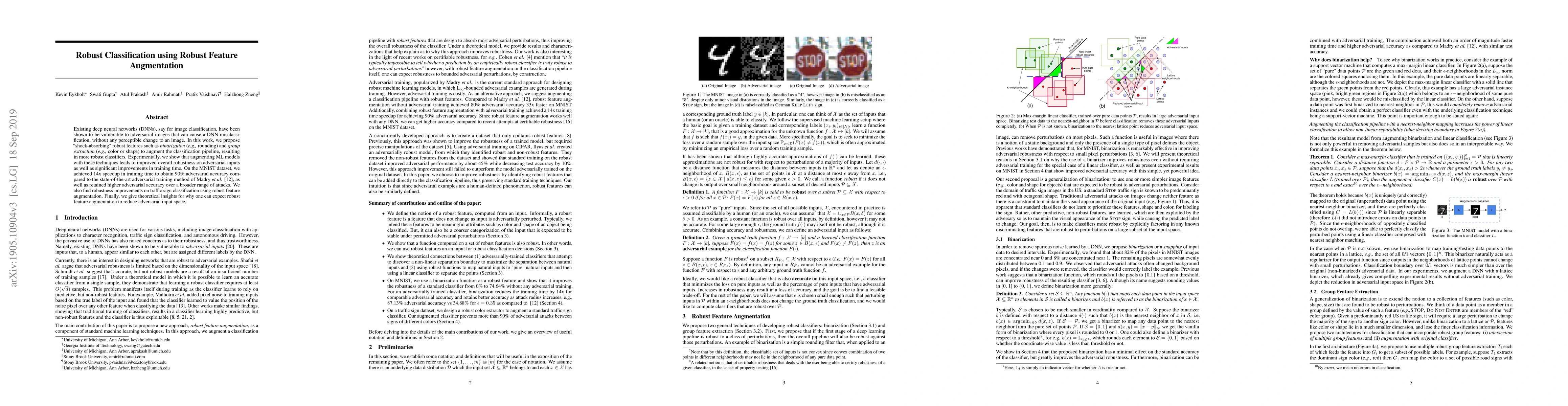 This paper proposes robust feature augmentation techniques, such as binarization and group extraction, to enhance the robustness of deep neural networks against adversarial attacks. Experimental results show significant improvements in adversarial accuracy and training speed on datasets like MNIST and traffic sign classification.