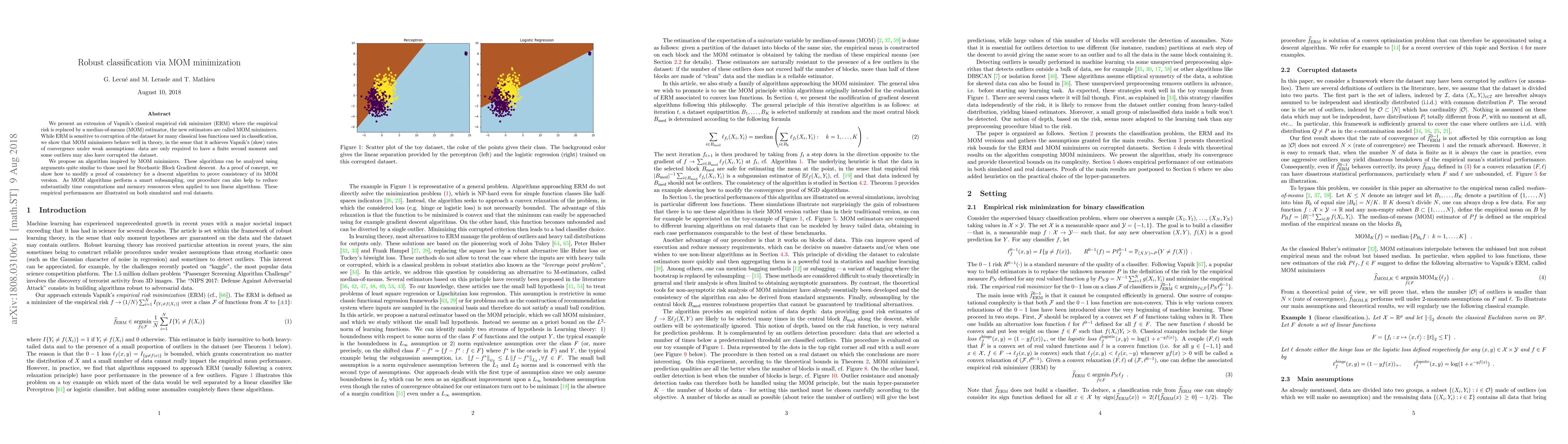 We present an extension of Vapnik's classical empirical risk minimizer (ERM) where the empirical risk is replaced by a median-of-means (MOM) estimator, the new estimators are called MOM minimizers. While ERM is sensitive to corruption of the dataset for many classical loss functions used in classification, we show that MOM minimizers behave well in theory, in the sense that it achieves Vapnik's (slow) rates of convergence under weak assumptions: data are only required to have a finite second moment and some outliers may also have corrupted the dataset. We propose an algorithm inspired by MOM minimizers. These algorithms can be analyzed using arguments quite similar to those used for Stochastic Block Gradient descent. As a proof of concept, we show how to modify a proof of consistency for a descent algorithm to prove consistency of its MOM version. As MOM algorithms perform a smart subsampling, our procedure can also help to reduce substantially time computations and memory ressources when applied to non linear algorithms. These empirical performances are illustrated on both simulated and real datasets.
