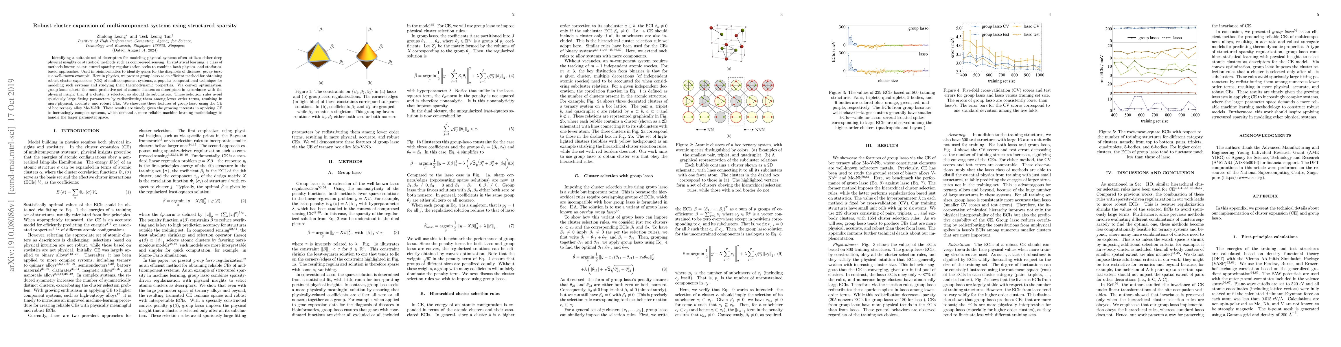 This paper proposes using group lasso, a structured sparsity regularization method, to develop robust cluster expansions for modeling complex multicomponent systems. By leveraging both physical insights and statistical learning, group lasso selects the most predictive atomic clusters, ensuring more accurate and reliable thermodynamic models for systems like bcc ternary alloy Mo-V-Nb.