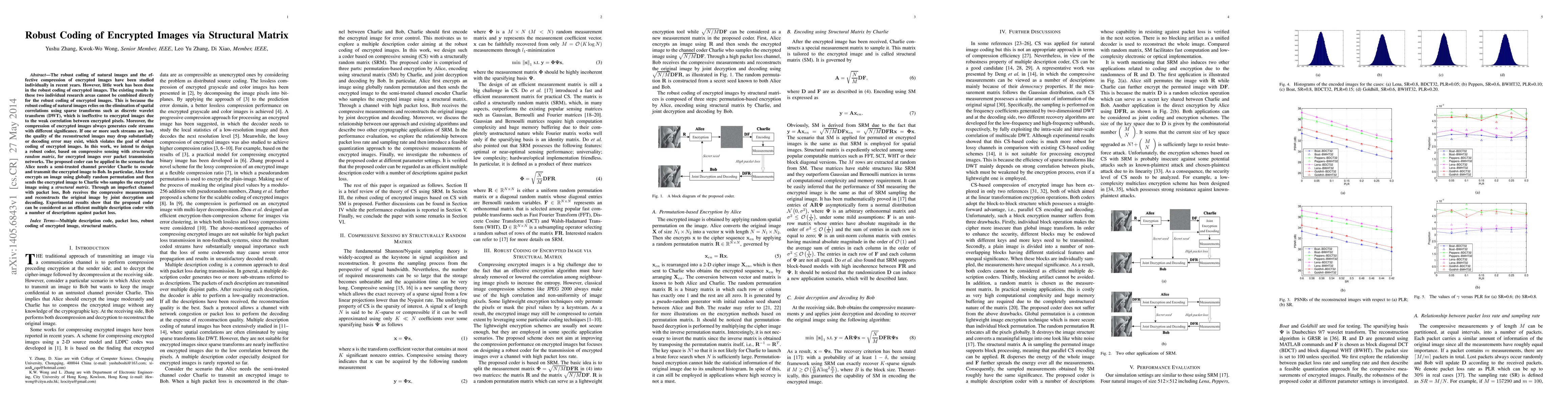 This paper proposes a robust coding method for encrypted images using compressive sensing with a structurally random matrix to address the challenge of packet loss in transmission networks. The method combines encryption, sampling, and reconstruction to ensure efficient multiple description coding, enabling effective recovery of the original image despite packet loss.