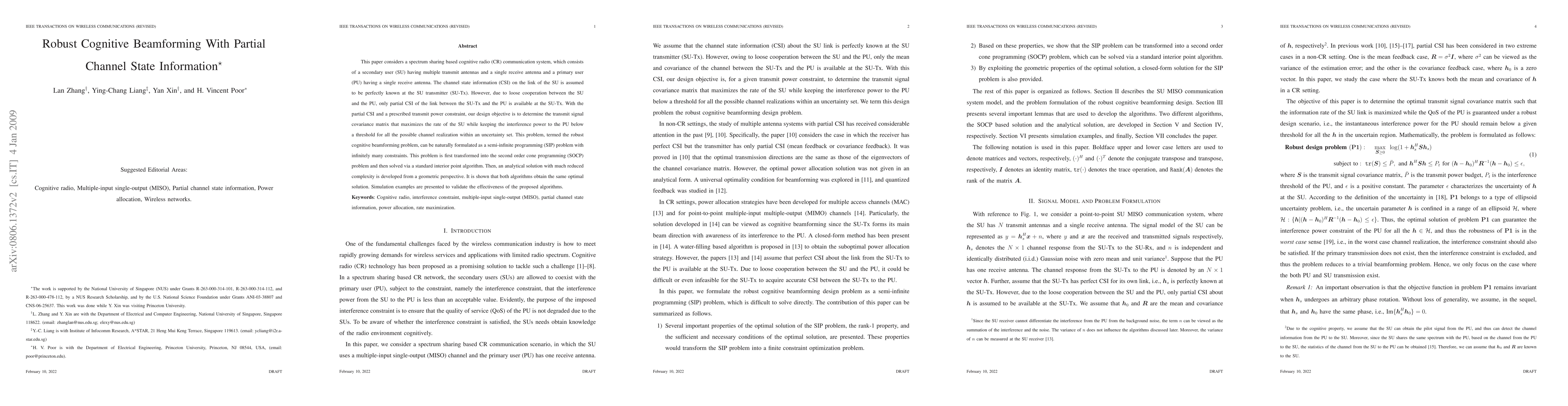 This paper develops a solution to optimize cognitive beamforming in a spectrum sharing CR system with partial CSI, aiming to maximize SU rate while minimizing interference power to PU.