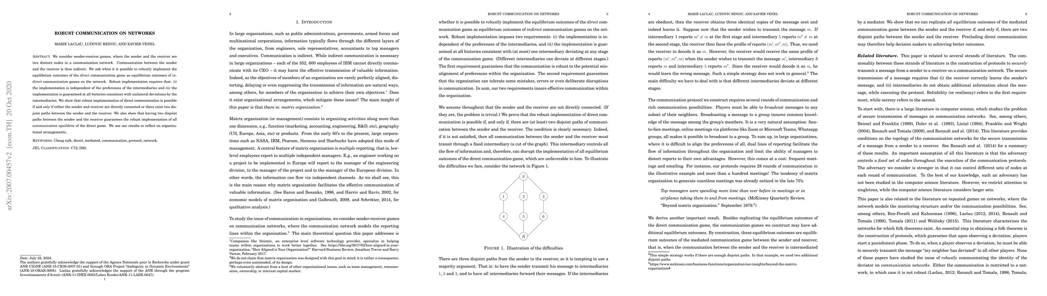 The paper analyzes sender-receiver games on networks, focusing on robust implementation of equilibrium outcomes from direct communication to indirect communication games. It considers dynamic adversaries controlling different sets of nodes each round.
