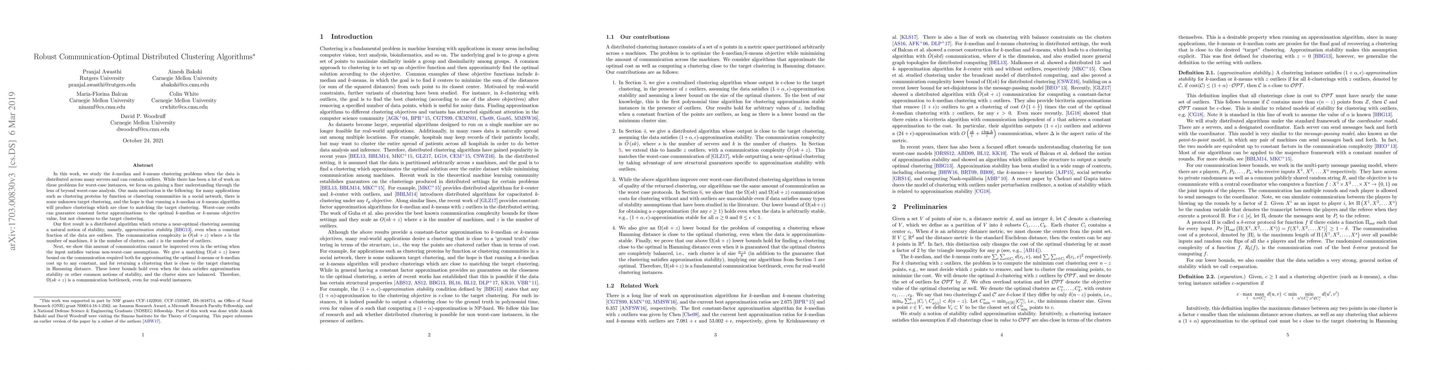 This paper presents distributed algorithms for $k$-median and $k$-means clustering that achieve near-optimal clustering under approximation stability, even with outliers. It establishes a communication complexity of $\tilde O(sk+z)$ and proves a matching lower bound of $\Omega(sk+z)$, indicating a communication bottleneck for real-world instances.