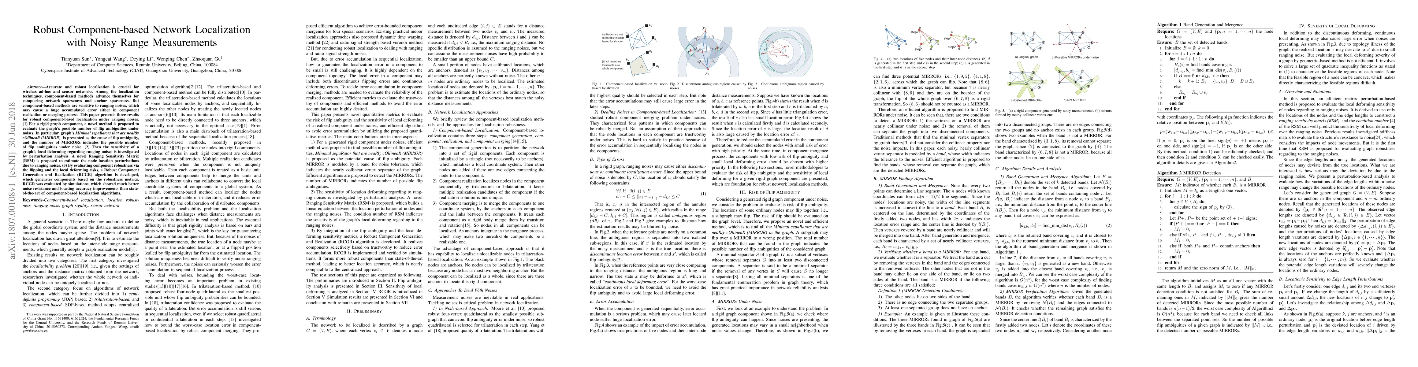 Accurate and robust localization is crucial for wireless ad-hoc and sensor networks. Among the localization techniques, component-based methods advance themselves for conquering network sparseness and anchor sparseness. But component-based methods are sensitive to ranging noises, which may cause a huge accumulated error either in component realization or merging process. This paper presents three results for robust component-based localization under ranging noises. (1) For a rigid graph component, a novel method is proposed to evaluate the graph's possible number of flip ambiguities under noises. In particular, graph's \emph{MInimal sepaRators that are neaRly cOllineaR (MIRROR)} is presented as the cause of flip ambiguity, and the number of MIRRORs indicates the possible number of flip ambiguities under noise. (2) Then the sensitivity of a graph's local deforming regarding ranging noises is investigated by perturbation analysis. A novel Ranging Sensitivity Matrix (RSM) is proposed to estimate the node location perturbations due to ranging noises. (3) By evaluating component robustness via the flipping and the local deforming risks, a Robust Component Generation and Realization (RCGR) algorithm is developed, which generates components based on the robustness metrics. RCGR was evaluated by simulations, which showed much better noise resistance and locating accuracy improvements than state-of-the-art of component-based localization algorithms.