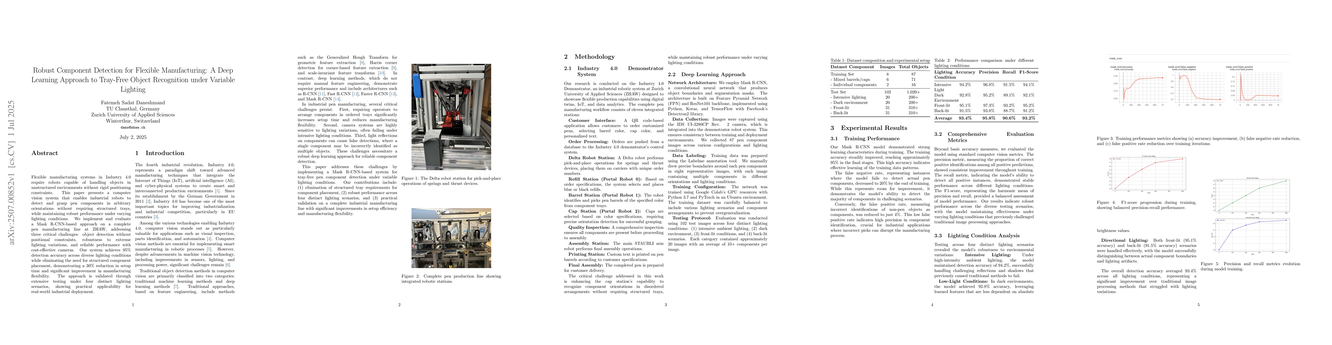 Flexible manufacturing systems in Industry 4.0 require robots capable of handling objects in unstructured environments without rigid positioning constraints. This paper presents a computer vision system that enables industrial robots to detect and grasp pen components in arbitrary orientations without requiring structured trays, while maintaining robust performance under varying lighting conditions. We implement and evaluate a Mask R-CNN-based approach on a complete pen manufacturing line at ZHAW, addressing three critical challenges: object detection without positional constraints, robustness to extreme lighting variations, and reliable performance with cost-effective cameras. Our system achieves 95% detection accuracy across diverse lighting conditions while eliminating the need for structured component placement, demonstrating a 30% reduction in setup time and significant improvement in manufacturing flexibility. The approach is validated through extensive testing under four distinct lighting scenarios, showing practical applicability for real-world industrial deployment.