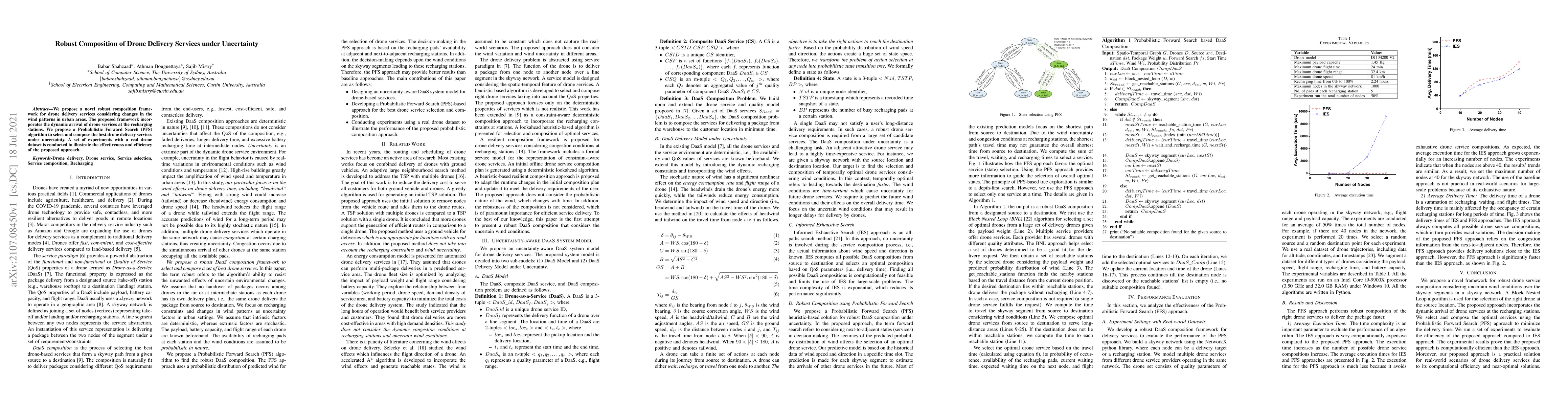 This paper introduces a robust framework for drone delivery services that accounts for wind pattern changes and dynamic recharging station arrivals. It employs a Probabilistic Forward Search (PFS) algorithm to optimize service composition under uncertainty, validated by experiments using real drone data.