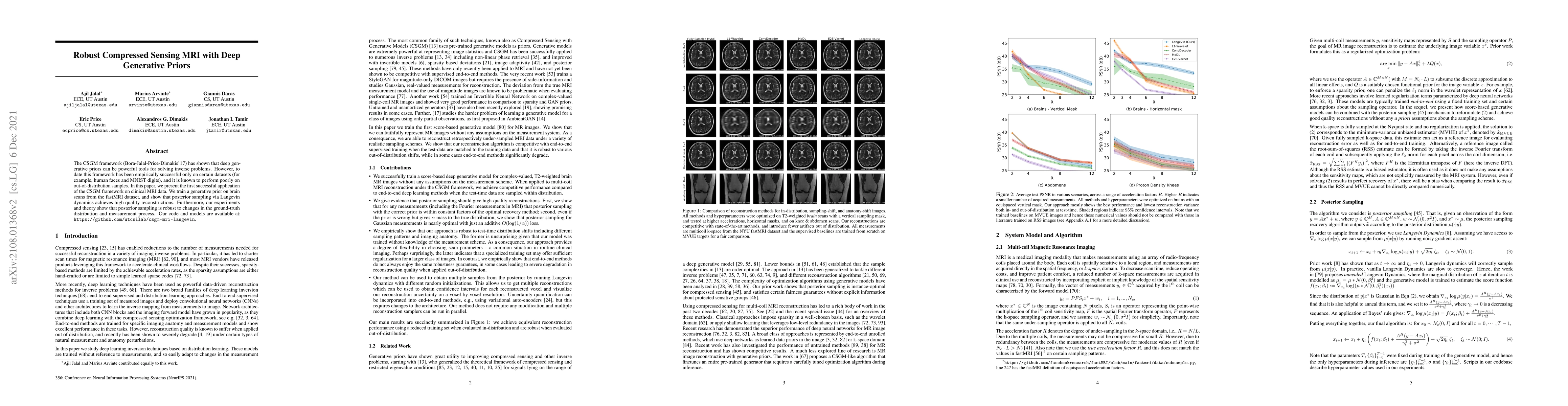 This paper applies the CSGM framework with deep generative priors to clinical MRI data, successfully reconstructing high-quality brain scans from the fastMRI dataset using posterior sampling via Langevin dynamics, demonstrating robustness to distribution and measurement changes. The authors make the code and models publicly available.