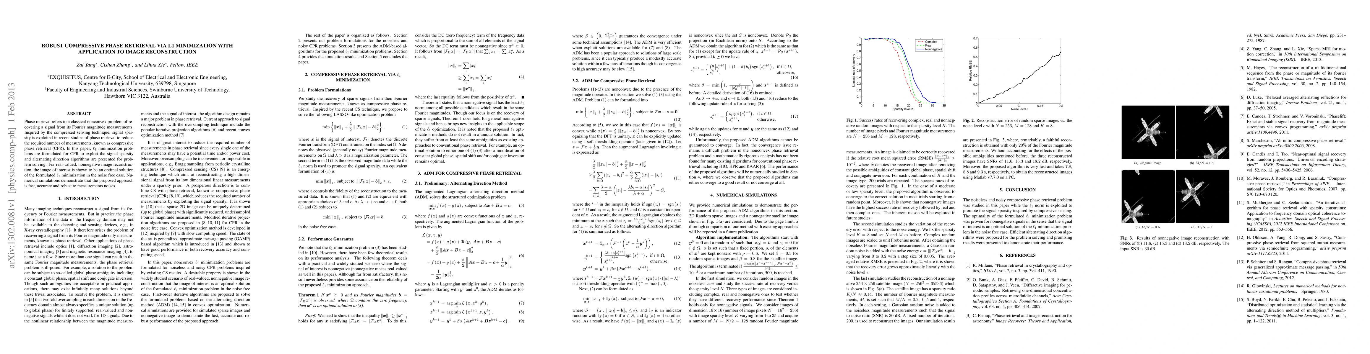 This paper proposes an L1 minimization approach for compressive phase retrieval to reconstruct sparse signals from Fourier magnitude measurements, demonstrating its effectiveness through alternating direction algorithms. The method is shown to accurately reconstruct real-valued, nonnegative images, and numerical simulations confirm its robustness and efficiency in noisy conditions.