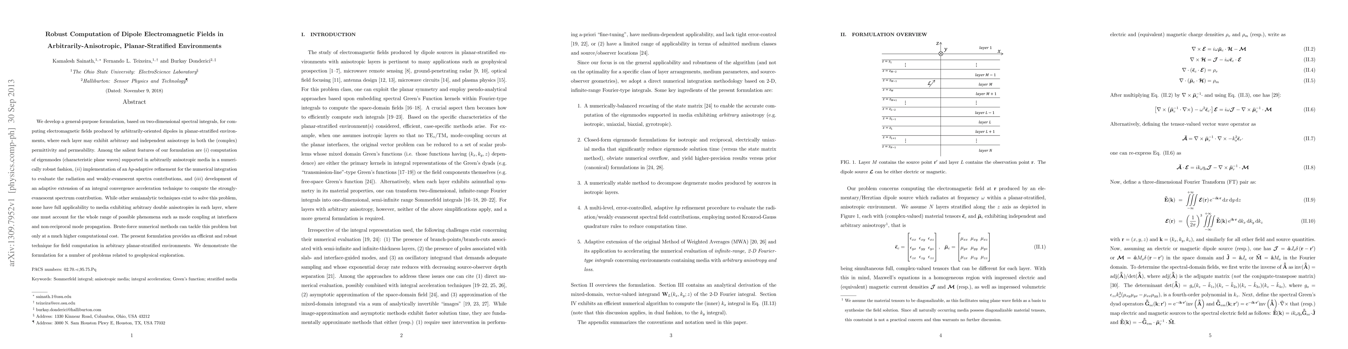 This paper presents a robust computational method for determining electromagnetic fields from dipoles in anisotropic, stratified environments using two-dimensional spectral integrals. The method efficiently handles complex permittivity and permeability anisotropies, mode coupling, and non-reciprocal propagation, offering a significant improvement over brute-force numerical techniques.