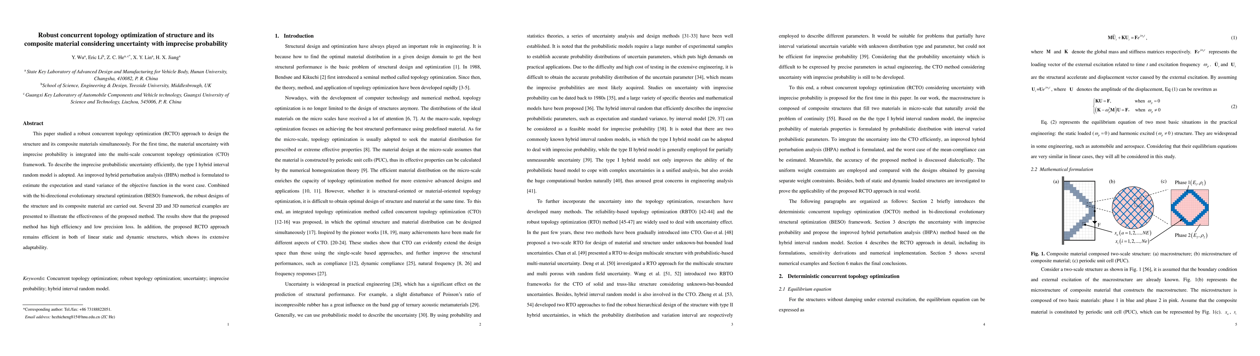 This paper proposes a robust concurrent topology optimization approach that integrates material uncertainty with imprecise probability into the design of structures and their composite materials. The type I hybrid interval random model and an improved hybrid perturbation analysis method are used to efficiently estimate uncertainties, demonstrating high efficiency and adaptability in both linear static and dynamic structures.