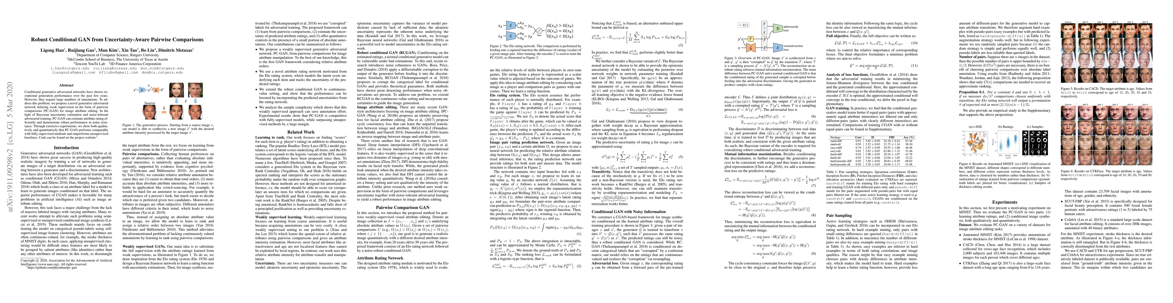 This paper introduces a novel conditional GAN (PC-GAN) that leverages weak supervision via pairwise comparisons to edit image attributes, achieving robust performance through Bayesian uncertainty estimation and noise-tolerant training. Experimental results show that PC-GAN performs competitively with fully-supervised methods while outperforming unsupervised baselines.