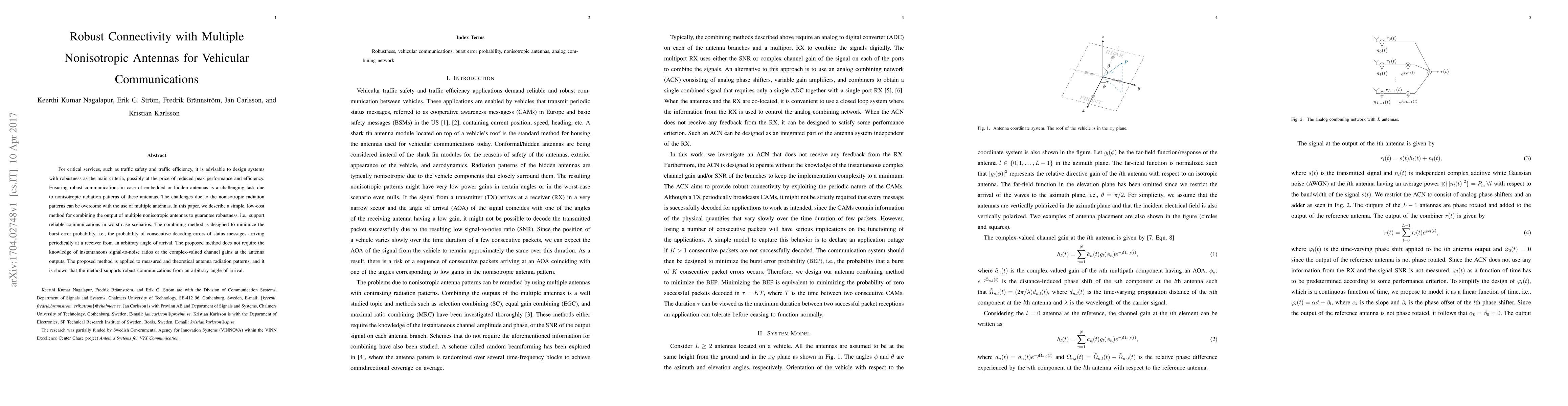 For critical services, such as traffic safety and traffic efficiency, it is advisable to design systems with robustness as the main criteria, possibly at the price of reduced peak performance and efficiency. Ensuring robust communications in case of embedded or hidden antennas is a challenging task due to nonisotropic radiation patterns of these antennas. The challenges due to the nonisotropic radiation patterns can be overcome with the use of multiple antennas. In this paper, we describe a simple, low-cost method for combining the output of multiple nonisotropic antennas to guarantee robustness, i.e., support reliable communications in worst-case scenarios. The combining method is designed to minimize the burst error probability, i.e., the probability of consecutive decoding errors of status messages arriving periodically at a receiver from an arbitrary angle of arrival. The proposed method does not require the knowledge of instantaneous signal-to-noise ratios or the complex-valued channel gains at the antenna outputs. The proposed method is applied to measured and theoretical antenna radiation patterns, and it is shown that the method supports robust communications from an arbitrary angle of arrival.