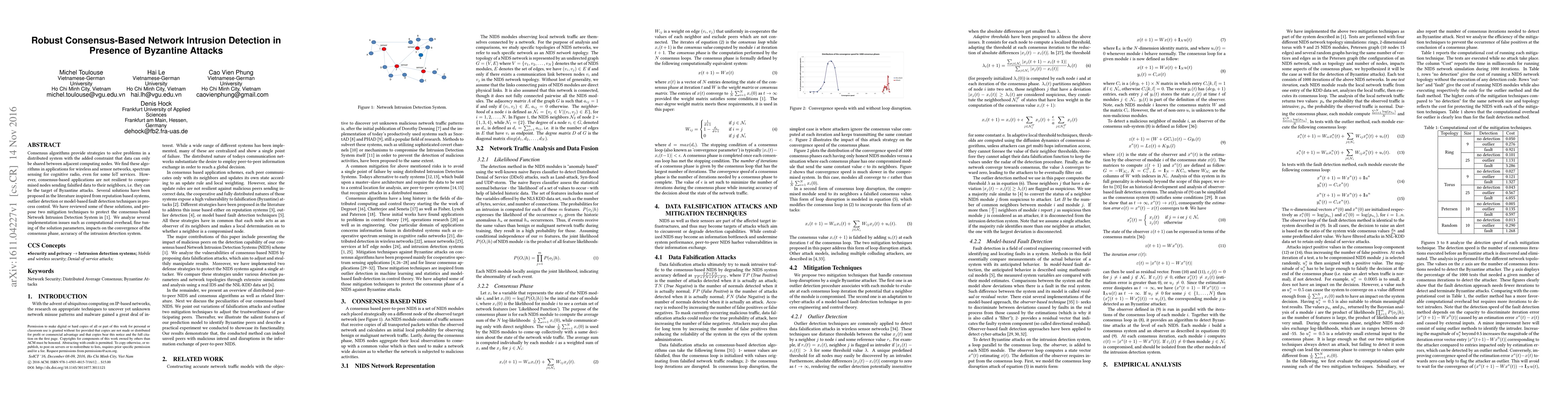 Consensus algorithms provide strategies to solve problems in a distributed system with the added constraint that data can only be shared between adjacent computing nodes. We find these algorithms in applications for wireless and sensor networks, spectrum sensing for cognitive radio, even for some IoT services. However, consensus-based applications are not resilient to compromised nodes sending falsified data to their neighbors, i.e. they can be the target of Byzantine attacks. Several solutions have been proposed in the literature inspired from reputation based systems, outlier detection or model-based fault detection techniques in process control. We have reviewed some of these solutions, and propose two mitigation techniques to protect the consensus-based Network Intrusion Detection System in \cite{toulouse2015consensus}. We analyze several implementation issues such as computational overhead, fine tuning of the solution parameters, impacts on the convergence of the consensus phase, accuracy of the intrusion detection system.