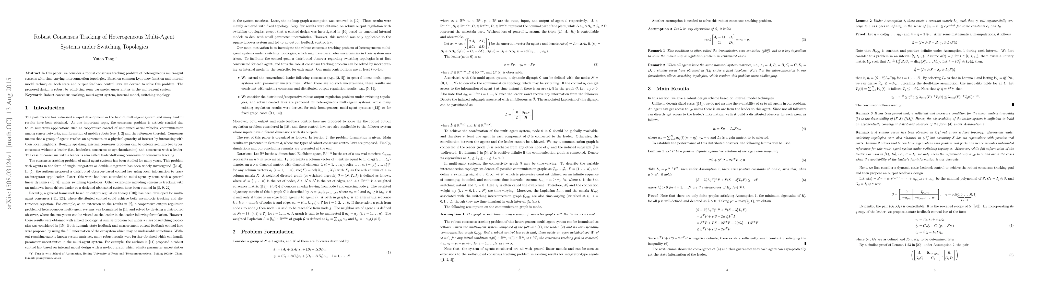This paper proposes robust consensus tracking control laws for heterogeneous multi-agent systems with switching topologies, using common Lyapunov functions and internal model techniques for both state and output feedback. The design accommodates parameter uncertainties, ensuring system robustness.