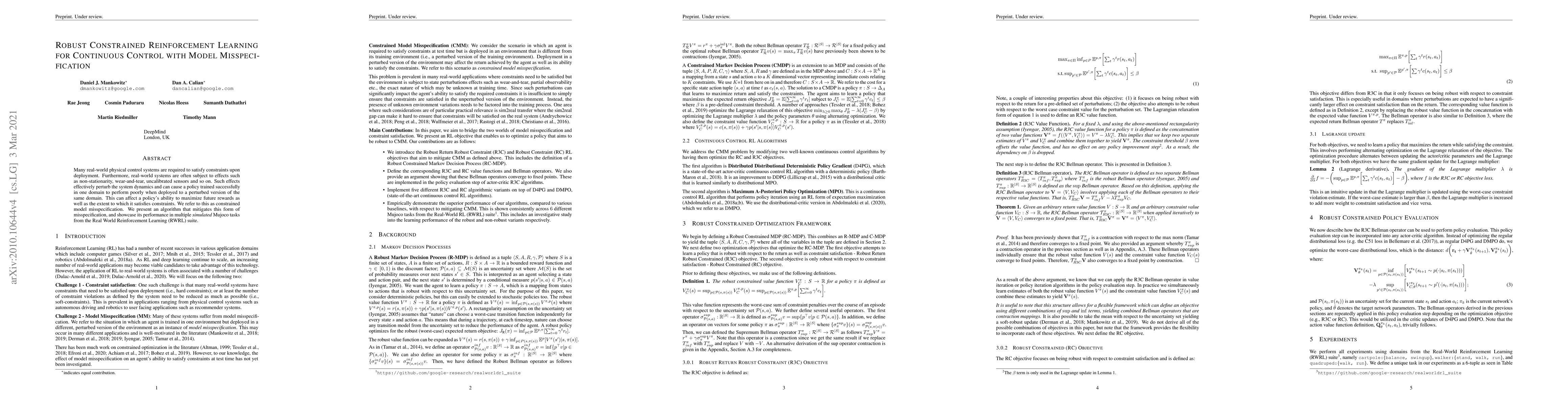 This paper proposes an algorithm for robust constrained reinforcement learning to handle model misspecification in continuous control systems, addressing issues like non-stationarity and sensor inaccuracies. The algorithm is demonstrated to improve performance in various simulated environments from the RWRL suite.