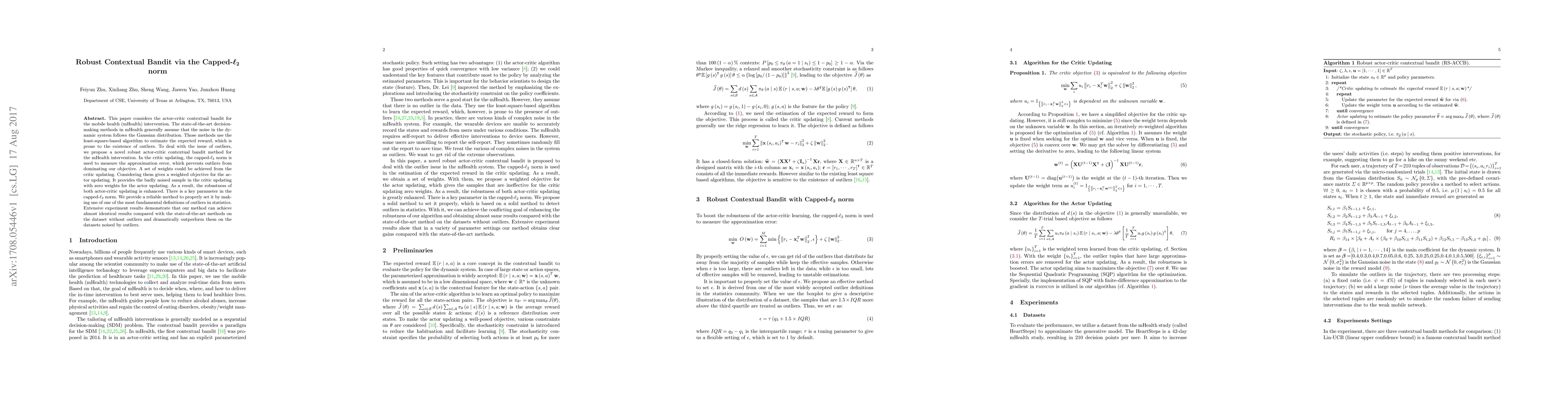 This paper considers the actor-critic contextual bandit for the mobile health (mHealth) intervention. The state-of-the-art decision-making methods in mHealth generally assume that the noise in the dynamic system follows the Gaussian distribution. Those methods use the least-square-based algorithm to estimate the expected reward, which is prone to the existence of outliers. To deal with the issue of outliers, we propose a novel robust actor-critic contextual bandit method for the mHealth intervention. In the critic updating, the capped-$\ell_{2}$ norm is used to measure the approximation error, which prevents outliers from dominating our objective. A set of weights could be achieved from the critic updating. Considering them gives a weighted objective for the actor updating. It provides the badly noised sample in the critic updating with zero weights for the actor updating. As a result, the robustness of both actor-critic updating is enhanced. There is a key parameter in the capped-$\ell_{2}$ norm. We provide a reliable method to properly set it by making use of one of the most fundamental definitions of outliers in statistics. Extensive experiment results demonstrate that our method can achieve almost identical results compared with the state-of-the-art methods on the dataset without outliers and dramatically outperform them on the datasets noised by outliers.