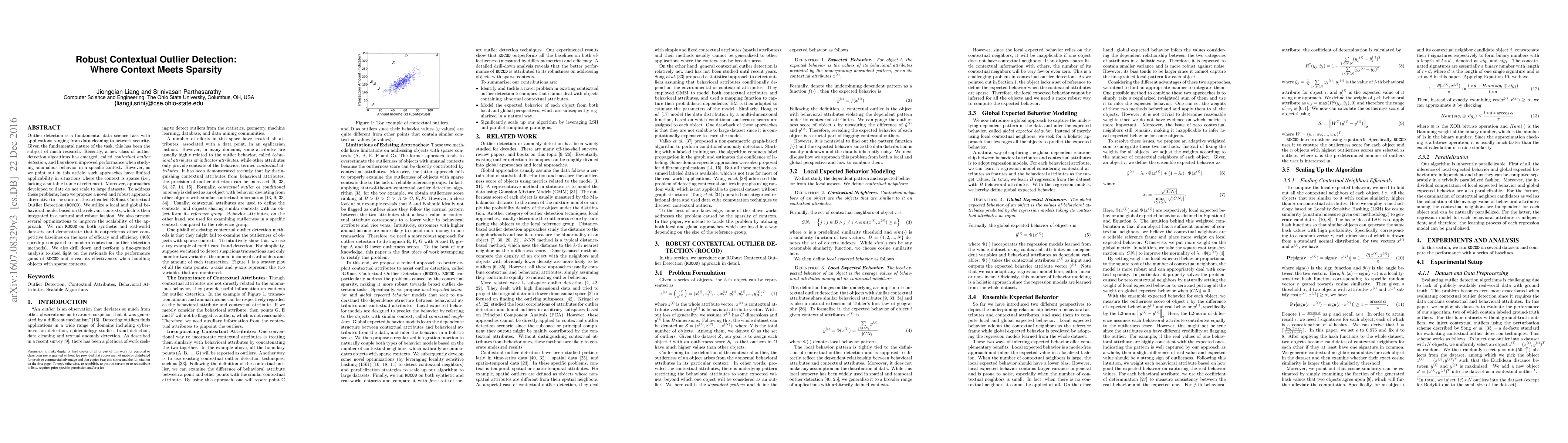 This paper introduces a novel RObust Contextual Outlier Detection (ROCOD) method that effectively addresses sparse context and scalability issues in contextual outlier detection. ROCOD outperforms existing methods by integrating local and global behavioral models and demonstrates a 40X speedup on large datasets.