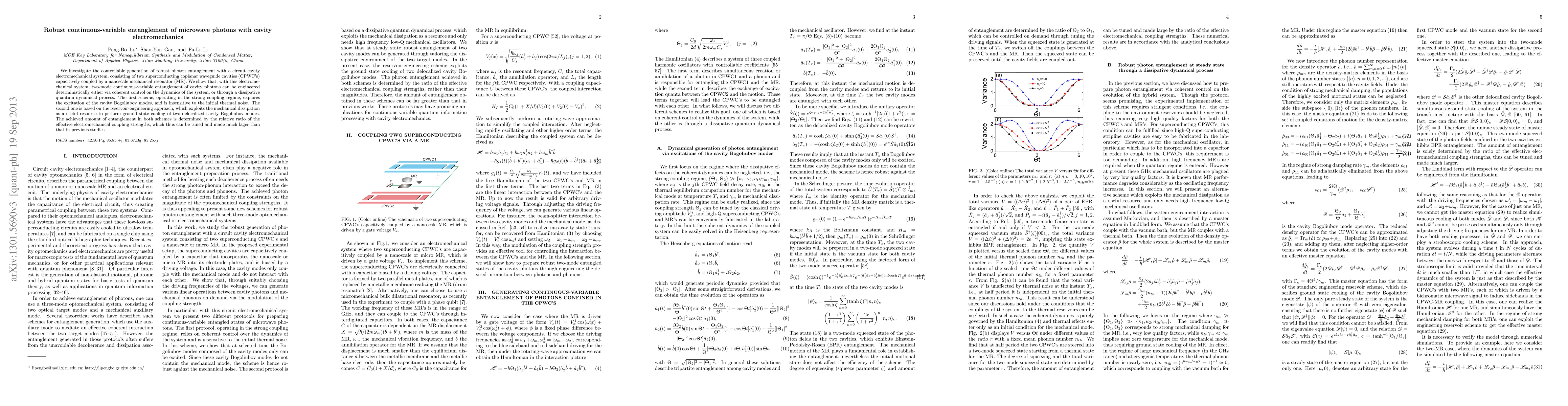 This paper explores the generation of robust continuous-variable entanglement between microwave photons in a circuit cavity electromechanical system using a nanoscale mechanical resonator. Two methods are presented: one via coherent control in the strong coupling regime and another through reservoir-engineering based on mechanical dissipation, both achieving tunable entanglement levels.
