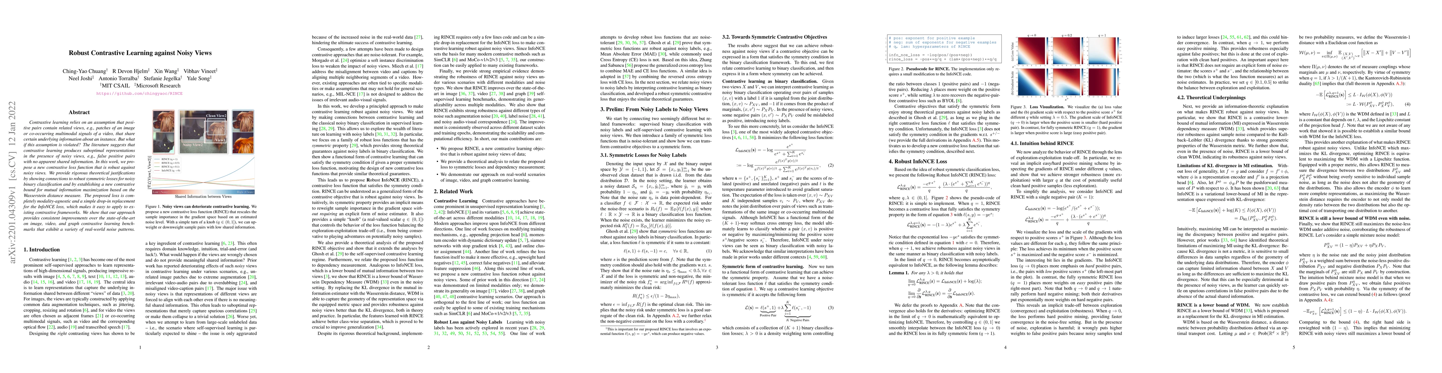 Contrastive learning relies on an assumption that positive pairs contain related views, e.g., patches of an image or co-occurring multimodal signals of a video, that share certain underlying information about an instance. But what if this assumption is violated? The literature suggests that contrastive learning produces suboptimal representations in the presence of noisy views, e.g., false positive pairs with no apparent shared information. In this work, we propose a new contrastive loss function that is robust against noisy views. We provide rigorous theoretical justifications by showing connections to robust symmetric losses for noisy binary classification and by establishing a new contrastive bound for mutual information maximization based on the Wasserstein distance measure. The proposed loss is completely modality-agnostic and a simple drop-in replacement for the InfoNCE loss, which makes it easy to apply to existing contrastive frameworks. We show that our approach provides consistent improvements over the state-of-the-art on image, video, and graph contrastive learning benchmarks that exhibit a variety of real-world noise patterns.