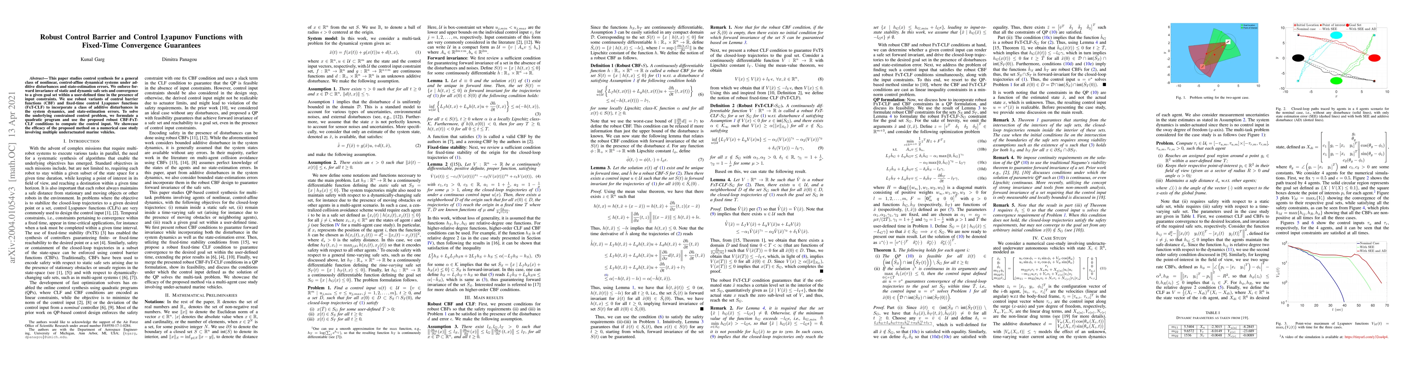 This paper studies control synthesis for a general class of nonlinear, control-affine dynamical systems under additive disturbances and state-estimation errors. We enforce forward invariance of static and dynamic safe sets and convergence to a given goal set within a user-defined time in the presence of input constraints. We use robust variants of control barrier functions (CBF) and fixed-time control Lyapunov functions (FxT-CLF) to incorporate a class of additive disturbances in the system dynamics, and state-estimation errors. To solve the underlying constrained control problem, we formulate a quadratic program and use the proposed robust CBF-FxT-CLF conditions to compute the control input. We showcase the efficacy of the proposed method on a numerical case study involving multiple underactuated marine vehicles.