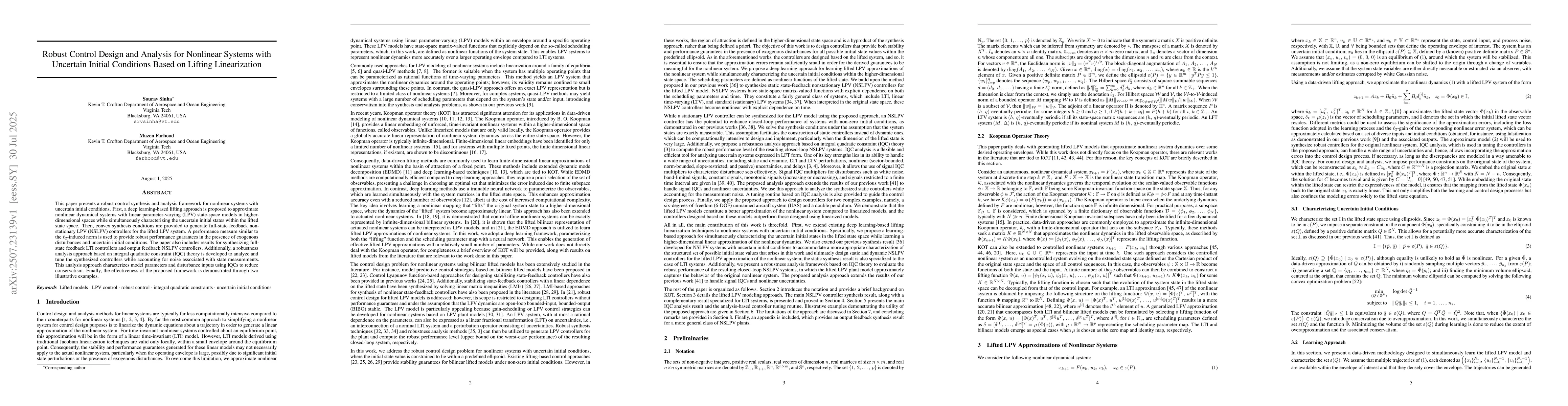 This paper presents a robust control synthesis and analysis framework for nonlinear systems with uncertain initial conditions. First, a deep learning-based lifting approach is proposed to approximate nonlinear dynamical systems with linear parameter-varying (LPV) state-space models in higher-dimensional spaces while simultaneously characterizing the uncertain initial states within the lifted state space. Then, convex synthesis conditions are provided to generate full-state feedback nonstationary LPV (NSLPV) controllers for the lifted LPV system. A performance measure similar to the l2-induced norm is used to provide robust performance guarantees in the presence of exogenous disturbances and uncertain initial conditions. The paper also includes results for synthesizing full-state feedback LTI controllers and output feedback NSLPV controllers. Additionally, a robustness analysis approach based on integral quadratic constraint (IQC) theory is developed to analyze and tune the synthesized controllers while accounting for noise associated with state measurements. This analysis approach characterizes model parameters and disturbance inputs using IQCs to reduce conservatism. Finally, the effectiveness of the proposed framework is demonstrated through two illustrative examples.