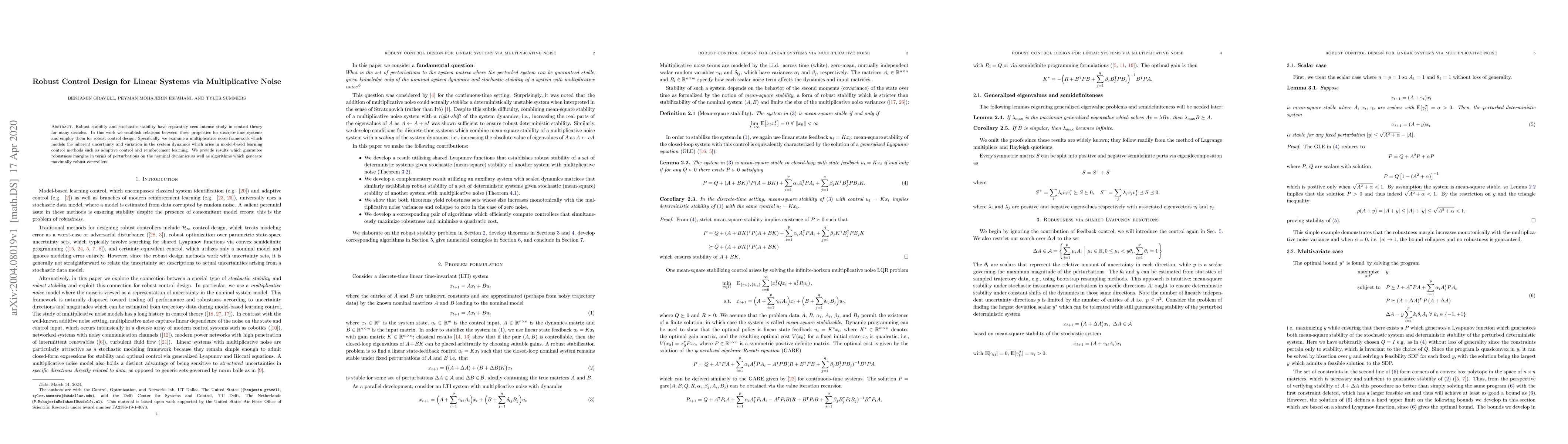 This paper investigates the relationship between robust stability and stochastic stability in discrete-time linear systems, focusing on a multiplicative noise framework for modeling uncertainties. It provides robustness margins and algorithms for designing maximally robust controllers in adaptive and reinforcement learning control methods.
