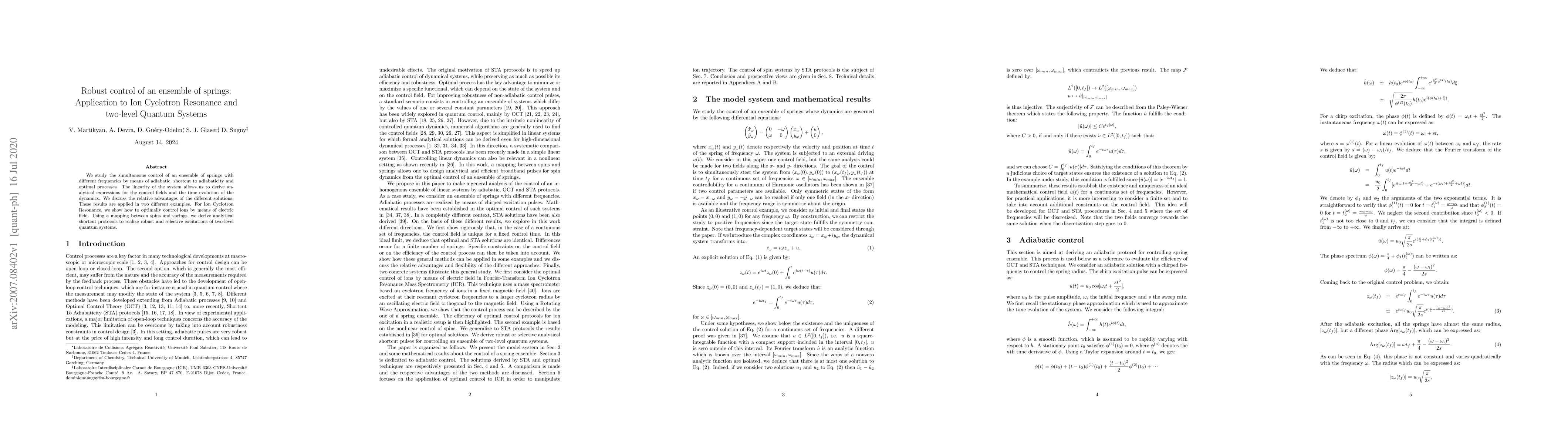 This paper explores robust control techniques for an ensemble of springs with varying frequencies, employing adiabatic, shortcut to adiabaticity, and optimal processes. The study provides analytical expressions for control fields and dynamics, demonstrating their application in Ion Cyclotron Resonance and two-level quantum systems through electric field control and spin-spring mapping.