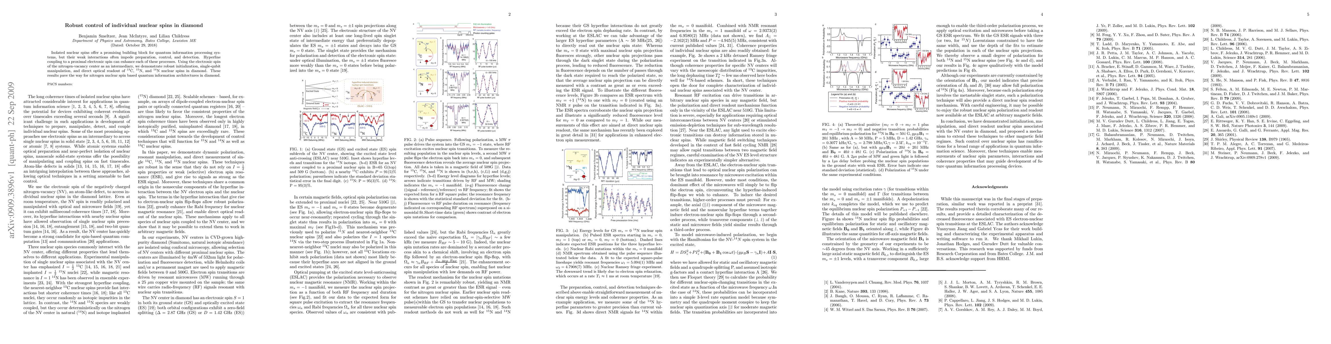 This paper demonstrates the robust control of individual nuclear spins in diamond using the electronic spin of a nitrogen-vacancy center, achieving initialization, single-qubit manipulation, and optical readout for 13C, 15N, and 14N, paving the way for quantum information processing.